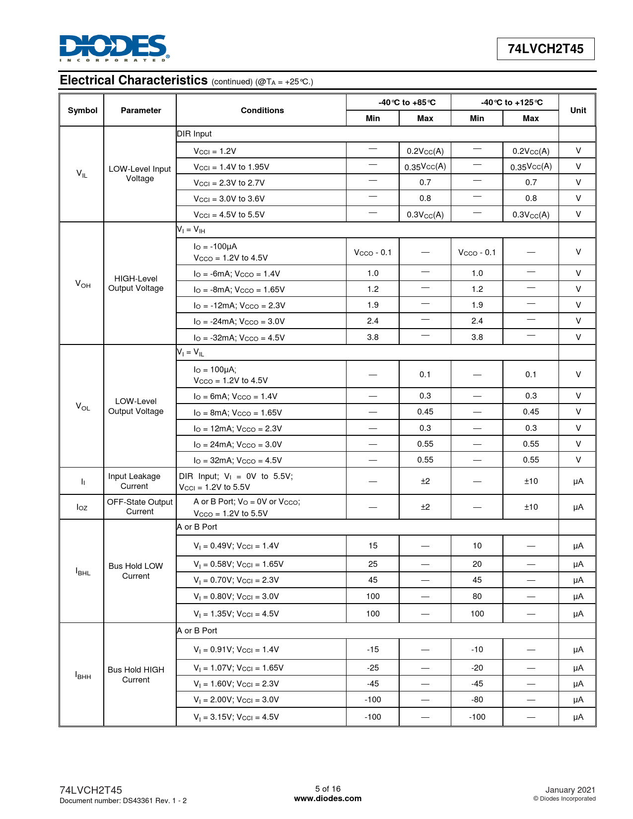 74LVCH2T45. Electrical Characteristics. -40°C to +85°C. -40°C to +125°C. Symbol. Parameter. Conditions. Unit. Min. Max. www.diodes.com