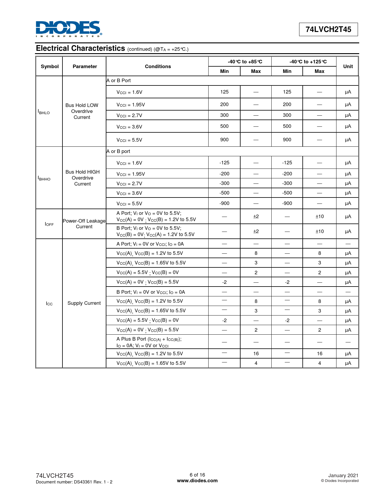 74LVCH2T45. Electrical Characteristics. -40°C to +85°C. -40°C to +125°C. Symbol. Parameter. Conditions. Unit. Min. Max. www.diodes.com