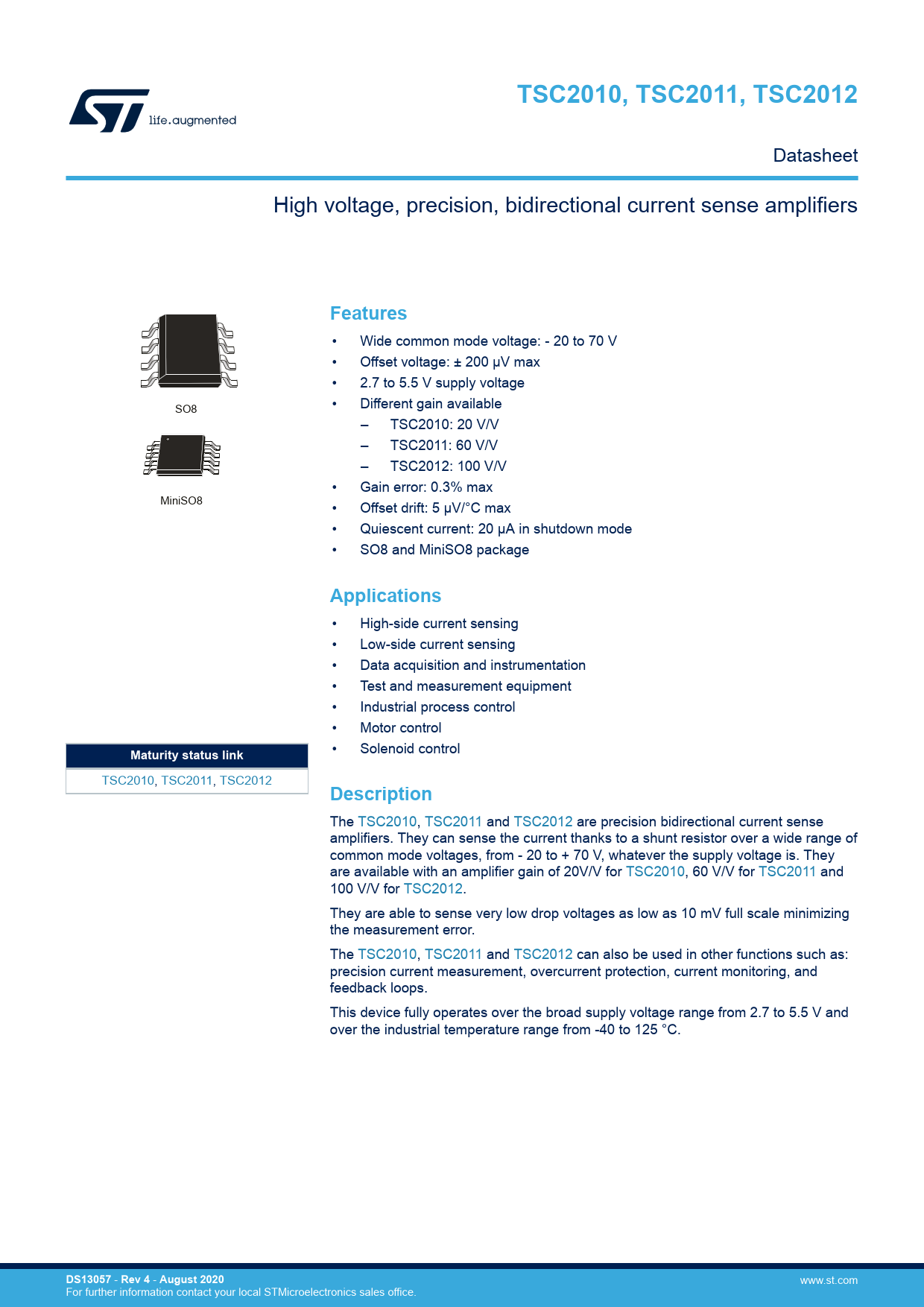 TSC2010, TSC2011, TSC2012. Features. Applications. Maturity status link. Description. DS13057. Rev 4. August 2020