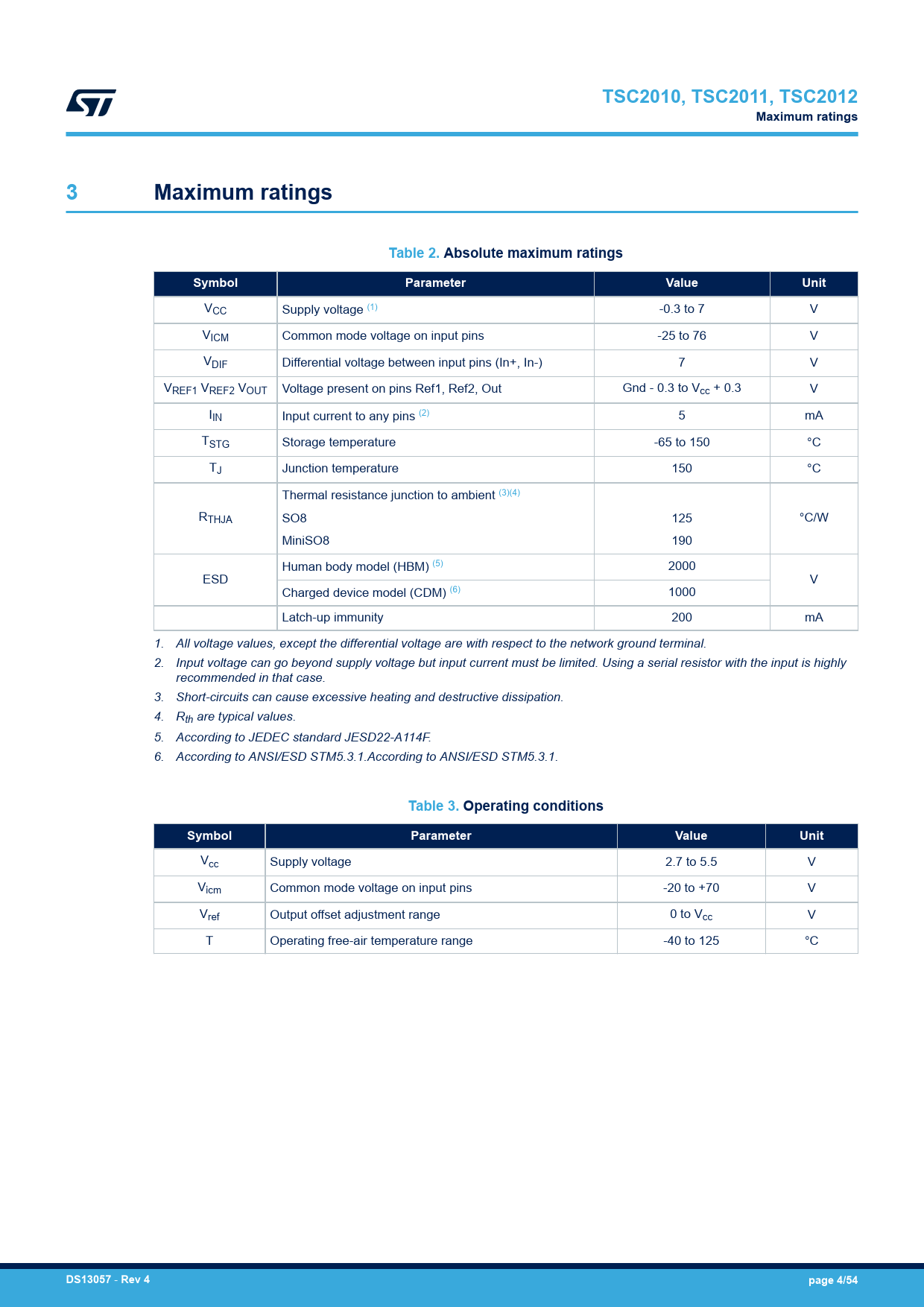 link to page 4 link to page 4 link to page 4 link to page 4 link to page 4 link to page 4 TSC2010, TSC2011, TSC2012Maximum ratings3Maximum ratingsTable 2. Absolute maximum ratingsSymbolParameterValueUnit VCC Supply voltage (1) -0.3 to 7 V VICM Common mode voltage on input pins -25 to 76 V VDIF Differential voltage between input pins (In+, In-) 7 V VREF1 VREF2 VOUT Voltage present on pins Ref1, Ref2, Out Gnd - 0.3 to Vcc + 0.3 V IIN Input current to any pins (2) 5 mA TSTG Storage temperature -65 to 150 °C TJ Junction temperature 150 °C Thermal resistance junction to ambient (3)(4) RTHJA SO8 125 °C/W MiniSO8 190 Human body model (HBM) (5) 2000 ESD V Charged device model (CDM) (6) 1000 Latch-up immunity 200 mA 1. All voltage values, except the differential voltage are with respect to the network ground terminal. 2. Input voltage can go beyond supply voltage but input current must be limited. Using a serial resistor with the input is highly recommended in that case. 3. Short-circuits can cause excessive heating and destructive dissipation. 4. Rth are typical values. 5. According to JEDEC standard JESD22-A114F. 6. According to ANSI/ESD STM5.3.1.According to ANSI/ESD STM5.3.1. Table 3. Operating conditionsSymbolParameterValueUnit Vcc Supply voltage 2.7 to 5.5 V Vicm Common mode voltage on input pins -20 to +70 V Vref Output offset adjustment range 0 to Vcc V T Operating free-air temperature range -40 to 125 °C DS13057 - Rev 4page 4/54 Document Outline 1 Diagram 2 Pin configuration 3 Maximum ratings 4 Electrical characteristics 4.1 Typical characteristics 5 Application information 5.1 Overview 5.2 Theory of operation 5.3 Unidirectionnal / bidirectionnal operation 5.4 RSENSE selection 5.5 Input offset voltage drift overtemperature 5.6 Error calculation 5.7 Shutdown mode 5.8 Stability 5.9 Power supply recommendation 5.10 PCB layout recommendations 5.11 EMI rejection ration (EMIRR) 5.12 Overload recovery 5.13 Application examples 5.13.1 Half-bridge motor control 5.13.2 Solenoid valve 6 Package information 6.1 SO8 package information 6.2 MiniSO8 package information 7 Ordering information Revision history