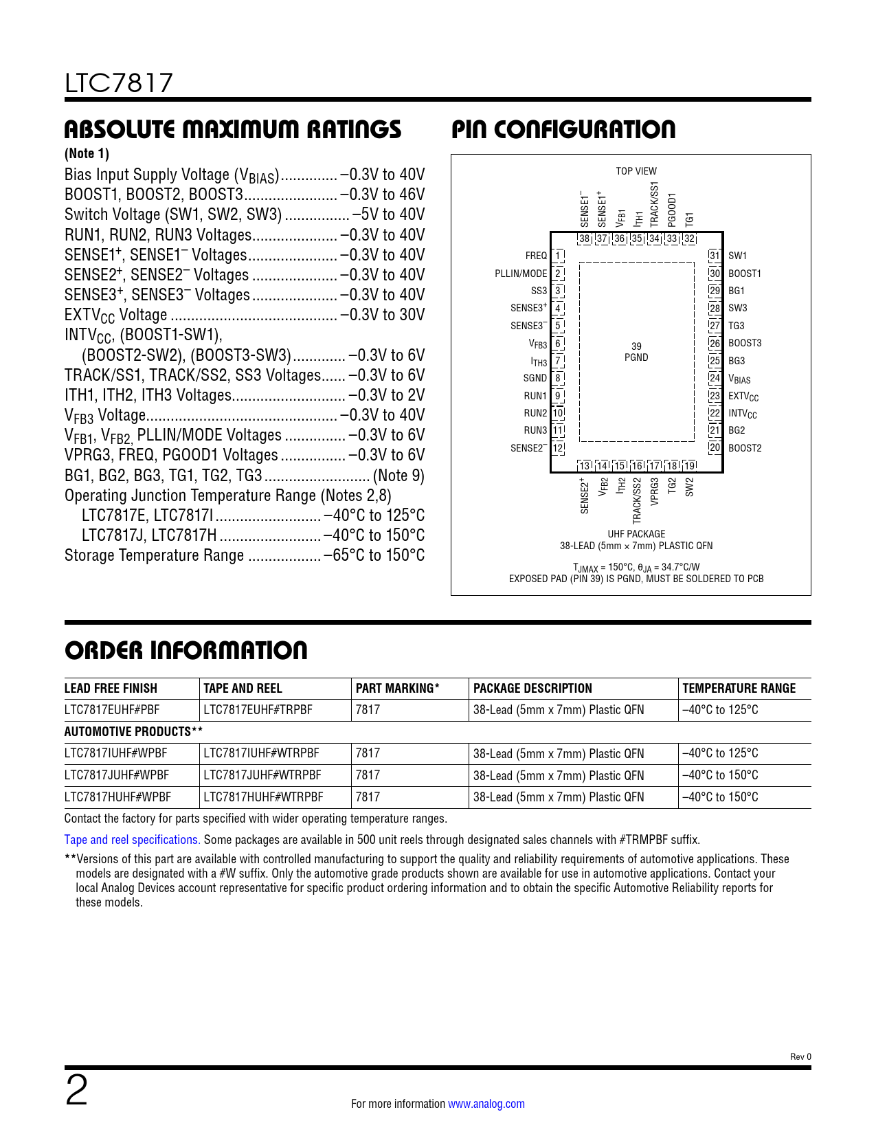 LTC7817IUHF#WPBF LTC7817IUHF#WTRPBF 7817 38-Lead (5mm x 7mm) Plastic QFN –40°C to 125°C LTC7817JUHF#WPBF LTC7817JUHF#WTRPBF 7817 38-Lead (5mm x 7mm) Plastic QFN –40°C to 150°C LTC7817HUHF#WPBF LTC7817HUHF#WTRPBF 7817 38-Lead (5mm x 7mm) Plastic QFN –40°C to 150°C Contact the factory for parts specified with wider operating temperature ranges. Tape and reel specifications. Some packages are available in 500 unit reels through designated sales channels with #TRMPBF suffix.
