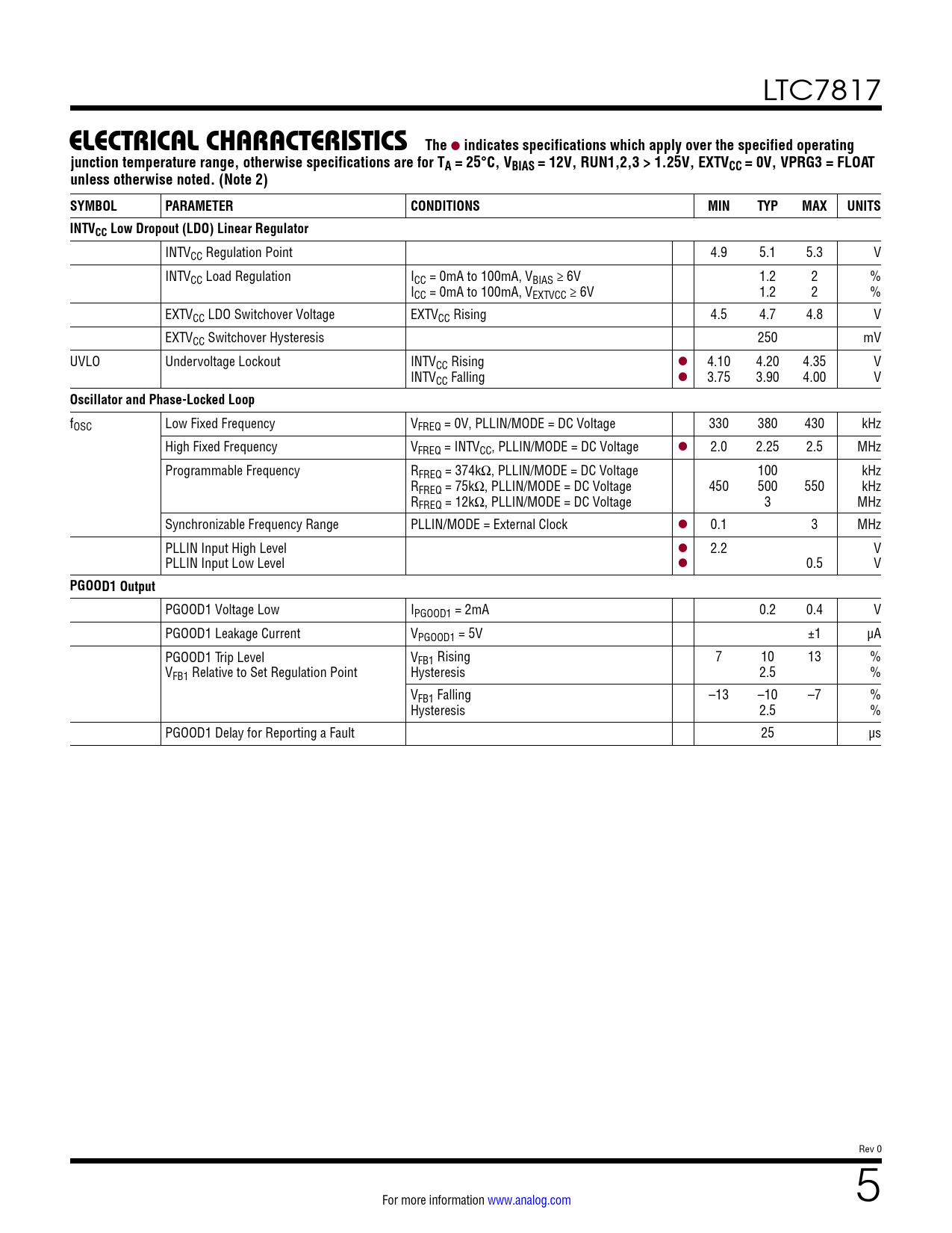 LTC7817 ELECTRICAL CHARACTERISTICSThe l indicates specifications which apply over the specified operatingjunction temperature range, otherwise specifications are for TA = 25°C, VBIAS = 12V, RUN1,2,3 > 1.25V, EXTVCC = 0V, VPRG3 = FLOATunless otherwise noted. (Note 2) SYMBOLPARAMETERCONDITIONSMINTYPMAXUNITSINTVCC Low Dropout (LDO) Linear Regulator INTVCC Regulation Point 4.9 5.1 5.3 V INTVCC Load Regulation ICC = 0mA to 100mA, VBIAS ≥ 6V 1.2 2 % ICC = 0mA to 100mA, VEXTVCC ≥ 6V 1.2 2 % EXTVCC LDO Switchover Voltage EXTVCC Rising 4.5 4.7 4.8 V EXTVCC Switchover Hysteresis 250 mV UVLO Undervoltage Lockout INTVCC Rising l 4.10 4.20 4.35 V INTVCC Falling l 3.75 3.90 4.00 V Oscillator and Phase-Locked Loop fOSC Low Fixed Frequency VFREQ = 0V, PLLIN/MODE = DC Voltage 330 380 430 kHz High Fixed Frequency VFREQ = INTVCC, PLLIN/MODE = DC Voltage l 2.0 2.25 2.5 MHz Programmable Frequency RFREQ = 374kΩ, PLLIN/MODE = DC Voltage 100 kHz RFREQ = 75kΩ, PLLIN/MODE = DC Voltage 450 500 550 kHz RFREQ = 12kΩ, PLLIN/MODE = DC Voltage 3 MHz Synchronizable Frequency Range PLLIN/MODE = External Clock l 0.1 3 MHz PLLIN Input High Level l 2.2 V PLLIN Input Low Level l 0.5 V PGOOD1 Output PGOOD1 Voltage Low IPGOOD1 = 2mA 0.2 0.4 V PGOOD1 Leakage Current VPGOOD1 = 5V ±1 µA PGOOD1 Trip Level VFB1 Rising 7 10 13 % VFB1 Relative to Set Regulation Point Hysteresis 2.5 % VFB1 Falling –13 –10 –7 % Hysteresis 2.5 % PGOOD1 Delay for Reporting a Fault 25 µs Rev 0 For more information www.analog.com 5 Document Outline Features Applications Typical Application Description Absolute Maximum Ratings Order Information Pin Configuration Electrical Characteristics Typical Performance Characteristics Pin Functions Functional Diagram Operation Applications Information Typical Applications Typical Application Related Parts