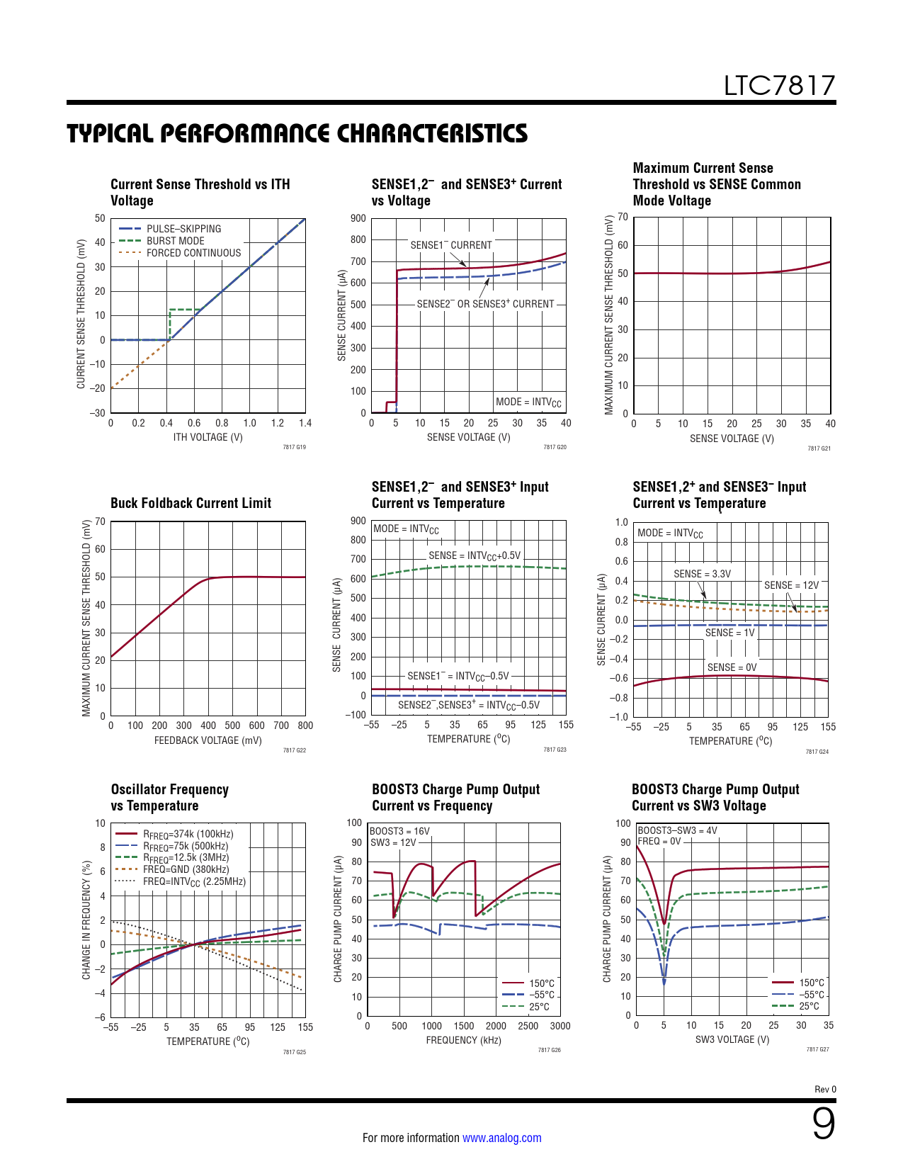 10 100 100 R BOOST3 = 16V BOOST3–SW3 = 4V FREQ=374k (100kHz) 8 R 90 SW3 = 12V 90 FREQ = 0V FREQ=75k (500kHz) RFREQ=12.5k (3MHz) 80 80 6 FREQ=GND (380kHz) FREQ=INTVCC (2.25MHz) 70 70 4 60 60 2 50 50 0 40 40 30 30 –2 CHANGE IN FREQUENCY (%) CHARGE PUMP CURRENT (μA) 20 150°C CHARGE PUMP CURRENT (μA) 20 150°C –4 10 –55°C 10 –55°C 25°C 25°C –6 0 0 –55 –25 5 35 65 95 125 155 0 500 1000 1500 2000 2500 3000 0 5 10 15 20 25 30 35 TEMPERATURE (oC) FREQUENCY (kHz) SW3 VOLTAGE (V) 7817 G25 7817 G26 7817 G27 Rev 0 For more information www.analog.com 9 Document Outline Features Applications Typical Application Description Absolute Maximum Ratings Order Information Pin Configuration Electrical Characteristics Typical Performance Characteristics Pin Functions Functional Diagram Operation Applications Information Typical Applications Typical Application Related Parts