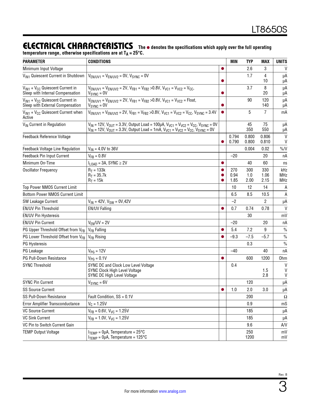 Minimum Input Voltage l 2.6 3 V VIN1 Quiescent Current in Shutdown VEN/UV1 = VEN/UV2 = 0V, VSYNC = 0V 1.7 4 µA l 10 µA VIN1 + VCC Quiescent Current in VEN/UV1 = VEN/UV2 = 2V, VFB1 = VFB2 >0.8V, VVC1 = VVC2 = VCC, 3.7 8 µA Sleep with Internal Compensation VSYNC = 0V l 20 µA VIN1 + VCC Quiescent Current in VEN/UV1 = VEN/UV2 = 2V, VFB1 = VFB2 >0.8V, VVC1 = VVC2 = Float, 90 120 µA Sleep with External Compensation VSYNC = 0V l 140 µA VIN1 + VCC Quiescent Current when VEN/UV1 = VEN/UV2 = 2V, VFB1 = VFB2 >0.8V, VVC1 = VVC2 = VCC, VSYNC = 3.4V l 5 7 mA Active VIN Current in Regulation VIN = 12V, VOUT = 3.3V, Output Load = 100µA, VVC1 = VVC2 = VCC, VSYNC = 0V 45 75 µA VIN = 12V, VOUT = 3.3V, Output Load = 1mA, VVC1 = VVC2 = VCC, VSYNC = 0V 350 550 µA Feedback Reference Voltage 0.794 0.800 0.806 V l 0.790 0.800 0.810 V Feedback Voltage Line Regulation VIN = 4.0V to 36V 0.004 0.02 %/V Feedback Pin Input Current VFB = 0.8V –20 20 nA Minimum On-Time ILOAD = 3A, SYNC ≥ 2V l 40 60 ns Oscillator Frequency RT = 133k l 270 300 330 kHz RT = 35.7k l 0.94 1.0 1.06 MHz RT = 15k l 1.85 2.00 2.15 MHz Top Power NMOS Current Limit 10 12 14 A Bottom Power NMOS Current Limit 6.5 8.5 10.5 A SW Leakage Current VIN = 42V, VSW = 0V,42V –2 2 µA EN/UV Pin Threshold EN/UV Falling l 0.7 0.74 0.78 V EN/UV Pin Hysteresis 30 mV EN/UV Pin Current VEN/UV = 2V –20 20 nA PG Upper Threshold Offset from VFB VFB Falling l 5.4 7.2 9 % PG Lower Threshold Offset from VFB VFB Rising l –9.3 –7.5 –5.7 % PG Hysteresis 0.3 % PG Leakage VPG = 12V –40 40 nA PG Pull-Down Resistance VPG = 0.1V l 600 1200 Ohm SYNC Threshold SYNC DC and Clock Low Level Voltage 0.4 V SYNC Clock High Level Voltage 1.5 V SYNC DC High Level Voltage 2.8 V SYNC Pin Current VSYNC = 6V 120 µA SS Source Current l 1.0 2.0 3.0 µA SS Pull-Down Resistance Fault Condition, SS = 0.1V 200 Ω Error Amplifier Transconductance VC = 1.25V 0.9 mS VC Source Current VFB = 0.6V, VVC = 1.25V 185 µA VC Sink Current VFB = 1.0V, VVC = 1.25V 185 µA VC Pin to Switch Current Gain 9.6 A/V TEMP Output Voltage ITEMP = 0µA, Temperature = 25°C 250 mV ITEMP = 0µA, Temperature = 125°C 1200 mV Rev. B For more information www.analog.com 3 Document Outline Features Applications Typical Application Description Absolute Maximum Ratings Order Information Pin Configuration Electrical Characteristics Typical Performance Characteristics Pin Functions Block Diagram Operation Applications Information Typical Applications Package Description Revision History Typical Application Related Parts