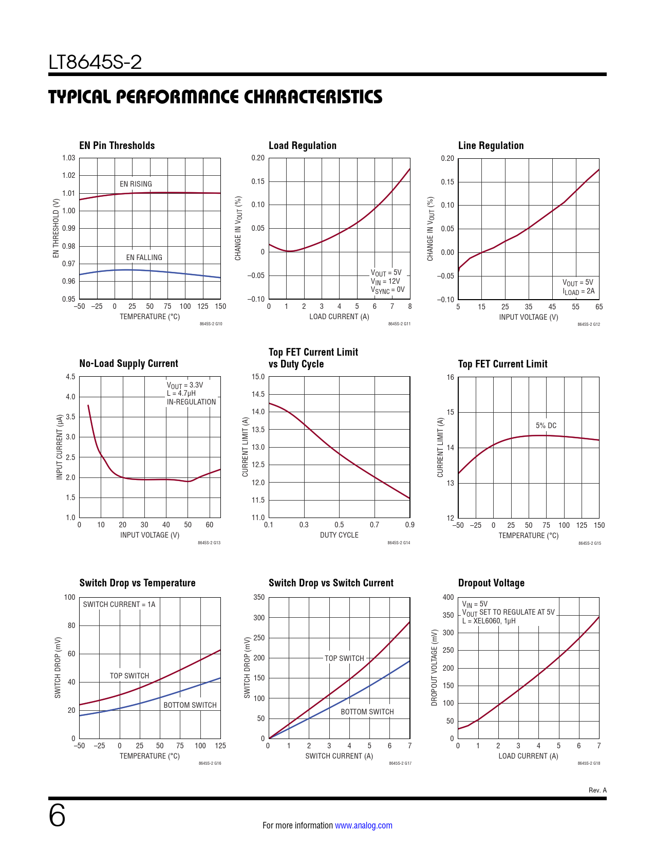1.03 0.20 0.20 1.02 EN RISING 0.15 0.15 1.01 (%) 0.10 (%) 0.10 1.00 OUT OUT 0.99 0.05 0.05 0.98 EN THRESHOLD (V) 0 0.00 EN FALLING CHANGE IN V CHANGE IN V 0.97 –0.05 VOUT = 5V –0.05 0.96 VIN = 12V VOUT = 5V VSYNC = 0V ILOAD = 2A 0.95 –0.10 –0.10 –50 –25 0 25 50 75 100 125 150 0 1 2 3 4 5 6 7 8 5 15 25 35 45 55 65 TEMPERATURE (°C) LOAD CURRENT (A) INPUT VOLTAGE (V) 8645S-2 G10 8645S-2 G11 8645S-2 G12