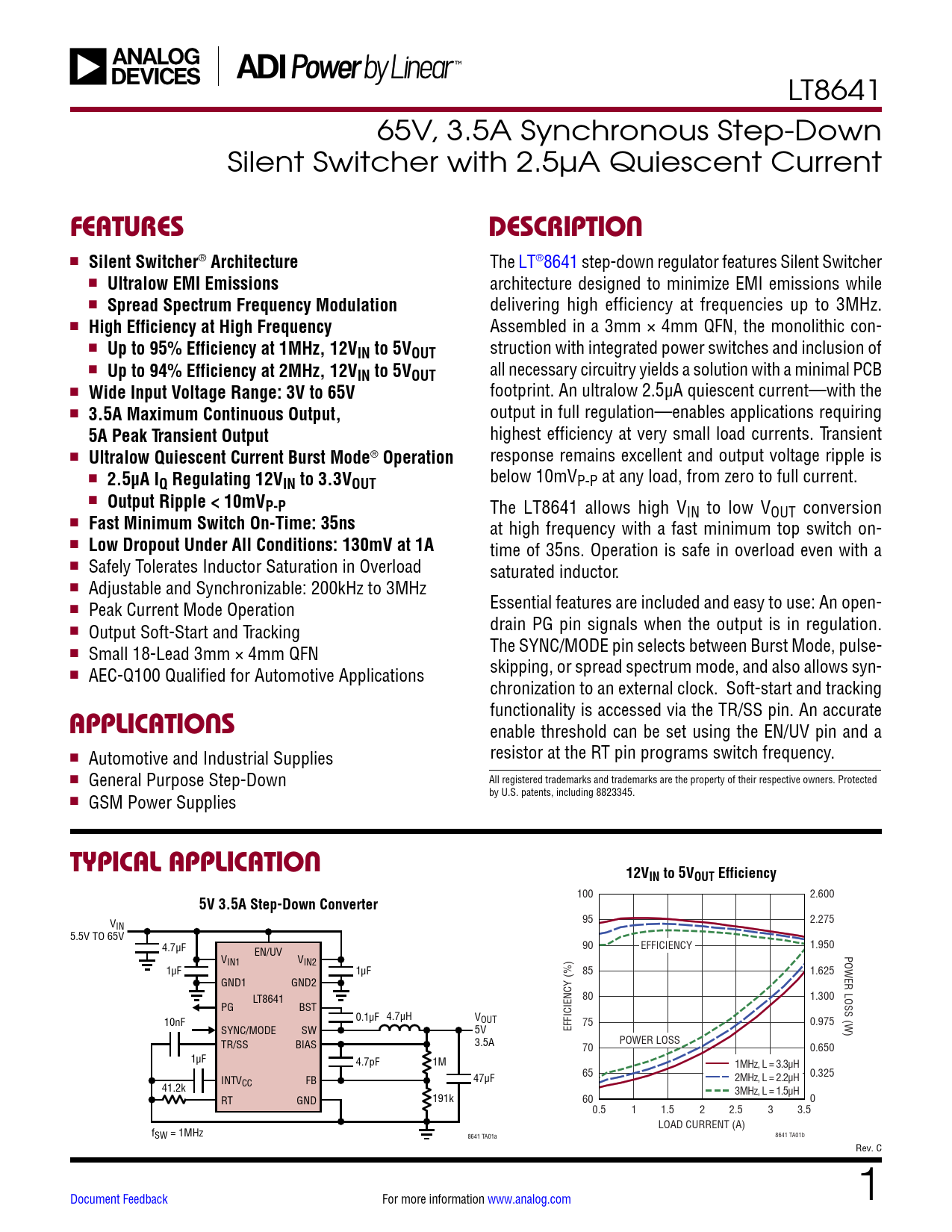 LT8641 65V, 3.5A Synchronous Step-Down Silent Switcher with 2.5µA Quiescent Current FEATURESDESCRIPTION n Silent Switcher ® Architecture The LT®8641 step-down regulator features Silent Switcher n Ultralow EMI Emissions architecture designed to minimize EMI emissions while n Spread Spectrum Frequency Modulation delivering high efficiency at frequencies up to 3MHz. n High Efficiency at High Frequency Assembled in a 3mm × 4mm QFN, the monolithic con- n Up to 95% Efficiency at 1MHz, 12V struction with integrated power switches and inclusion of IN to 5VOUT n Up to 94% Efficiency at 2MHz, 12V al necessary circuitry yields a solution with a minimal PCB IN to 5VOUT n Wide Input Voltage Range: 3V to 65V footprint. An ultralow 2.5µA quiescent current—with the n 3.5A Maximum Continuous Output, output in full regulation—enables applications requiring 5A Peak Transient Output highest efficiency at very small load currents. Transient n Ultralow Quiescent Current Burst Mode ® Operation response remains excellent and output voltage ripple is n 2.5μA I below 10mV Q Regulating 12VIN to 3.3VOUT P-P at any load, from zero to full current. n Output Ripple < 10mVP-P The LT8641 al ows high VIN to low VOUT conversion n Fast Minimum Switch On-Time: 35ns at high frequency with a fast minimum top switch on- n Low Dropout Under All Conditions: 130mV at 1A time of 35ns. Operation is safe in overload even with a n Safely Tolerates Inductor Saturation in Overload saturated inductor. n Adjustable and Synchronizable: 200kHz to 3MHz n Essential features are included and easy to use: An open- Peak Current Mode Operation n drain PG pin signals when the output is in regulation. Output Soft-Start and Tracking n The SYNC/MODE pin selects between Burst Mode, pulse- Small 18-Lead 3mm × 4mm QFN n skipping, or spread spectrum mode, and also allows syn- AEC-Q100 Qualified for Automotive Applications chronization to an external clock. Soft-start and tracking functionality is accessed via the TR/SS pin. An accurate APPLICATIONS enable threshold can be set using the EN/UV pin and a n resistor at the RT pin programs switch frequency. Automotive and Industrial Supplies n General Purpose Step-Down All registered trademarks and trademarks are the property of their respective owners. Protected by U.S. patents, including 8823345. n GSM Power Supplies TYPICAL APPLICATION12VIN to 5VOUT Efficiency 100 2.600 5V 3.5A Step-Down Converter V 95 2.275 IN 5.5V TO 65V 4.7µF 90 1.950 EN/UV EFFICIENCY POWER LOSS (W) VIN1 VIN2 1µF 1µF 85 1.625 GND1 GND2 LT8641 80 1.300 PG BST 0.1µF 4.7µH VOUT 10nF 75 0.975 SYNC/MODE SW 5V EFFICIENCY (%) TR/SS BIAS 3.5A POWER LOSS 70 0.650 1µF 4.7pF 1M 1MHz, L = 3.3μH 65 0.325 INTVCC FB 47µF 2MHz, L = 2.2μH 41.2k 3MHz, L = 1.5μH RT GND 191k 60 0 0.5 1 1.5 2 2.5 3 3.5 LOAD CURRENT (A) fSW = 1MHz 8641 TA01a 8641 TA01b Rev. C Document Feedback For more information www.analog.com 1 Document Outline Features Applications Typical Application Description Absolute Maximum Ratings Order Information Electrical Characteristics Pin Configuration Typical Performance Characteristics Pin Functions Block Diagram Operation Applications Information Typical Applications Package Description Revision History Typical Applications Related Parts