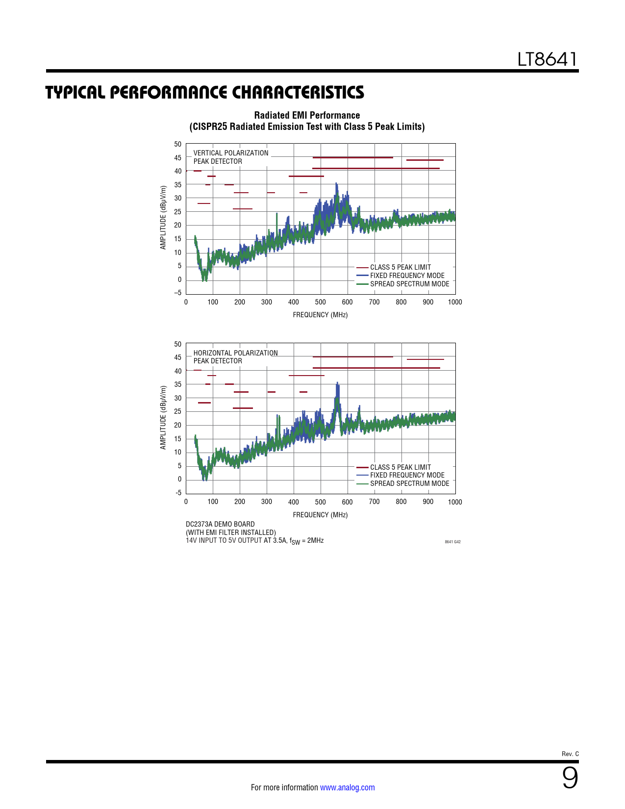 50 VERTICAL POLARIZATION 45 PEAK DETECTOR 40 35 30 25 20 15 AMPLITUDE (dBµV/m) 10 5 CLASS 5 PEAK LIMIT 0 FIXED FREQUENCY MODE SPREAD SPECTRUM MODE –5 0 100 200 300 400 500 600 700 800 900 1000 FREQUENCY (MHz) 50 HORIZONTAL POLARIZATION 45 PEAK DETECTOR 40 35 30 25 20 15 AMPLITUDE (dBµV/m) 10 5 CLASS 5 PEAK LIMIT 0 FIXED FREQUENCY MODE SPREAD SPECTRUM MODE -5 0 100 200 300 400 500 600 700 800 900 1000 FREQUENCY (MHz) DC2373A DEMO BOARD (WITH EMI FILTER INSTALLED) 14V INPUT TO 5V OUTPUT AT 3.5A, fSW = 2MHz 8641 G42 Rev. C For more information www.analog.com 9 Document Outline Features Applications Typical Application Description Absolute Maximum Ratings Order Information Electrical Characteristics Pin Configuration Typical Performance Characteristics Pin Functions Block Diagram Operation Applications Information Typical Applications Package Description Revision History Typical Applications Related Parts