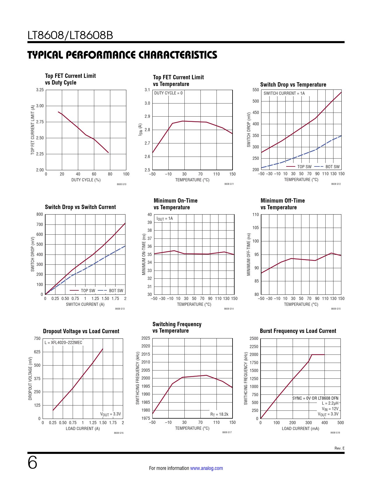 3.25 3.1 550 DUTY CYCLE = 0 SWITCH CURRENT = 1A 500 3.0 3.00 450 2.9 2.75 400 (A) 2.8 I SW 350 2.50 2.7 SWITCH DROP (mV) 300 TOP FET CURRENT LIMIT (A) 2.25 2.6 250 TOP SW BOT SW 2.00 2.5 200 0 20 40 60 80 100 –50 –10 30 70 110 150 –50 –30 –10 10 30 50 70 90 110 130 150 DUTY CYCLE (%) TEMPERATURE (°C) TEMPERATURE (°C) 8608 G10 8608 G11 8608 G12