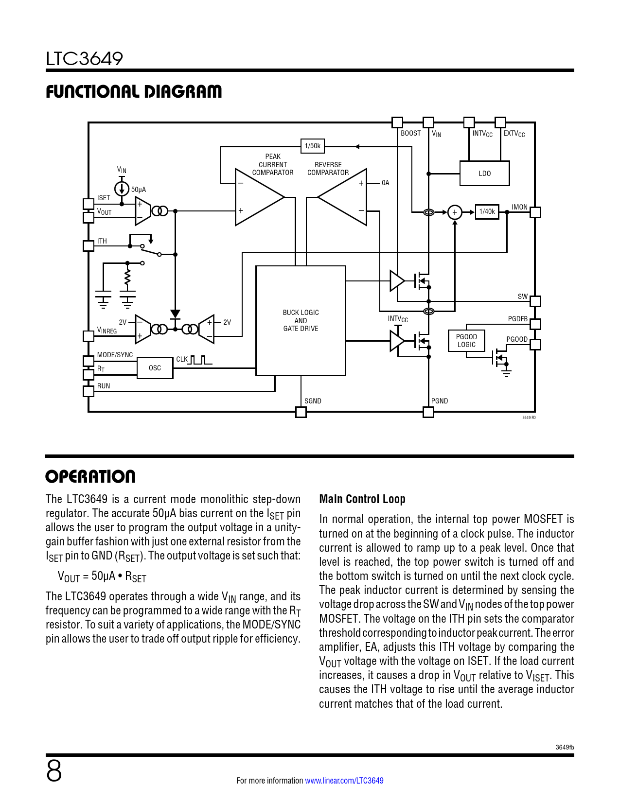 BOOST VIN INTVCC EXTVCC 1/50k PEAK CURRENT REVERSE VIN COMPARATOR COMPARATOR – LDO + 0A 50µA ISET + + VOUT – – + 1/40k IMON ITH SW – BUCK LOGIC INTV AND CC PGDFB 2V + 2V VINREG + GATE DRIVE – PGOOD PGOOD LOGIC MODE/SYNC CLK RT OSC RUN SGND PGND 3649 FD