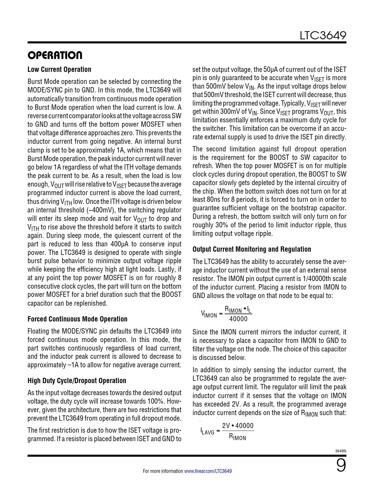 OPERATION Low Current Operation. Output Current Monitoring and Regulation. Forced Continuous Mode Operation