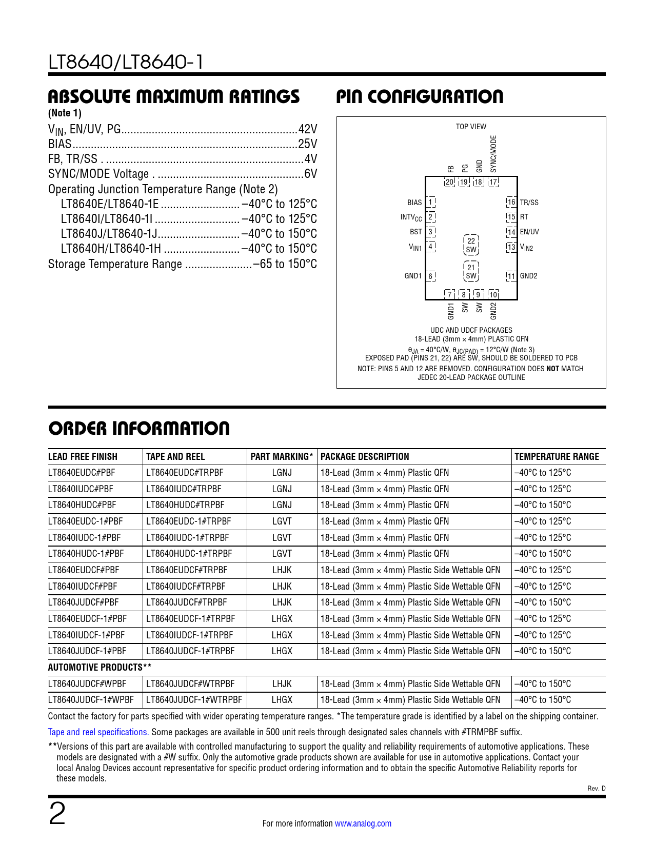 LT8640EUDC#PBF LT8640EUDC#TRPBF LGNJ 18-Lead (3mm × 4mm) Plastic QFN –40°C to 125°C LT8640IUDC#PBF LT8640IUDC#TRPBF LGNJ 18-Lead (3mm × 4mm) Plastic QFN –40°C to 125°C LT8640HUDC#PBF LT8640HUDC#TRPBF LGNJ 18-Lead (3mm × 4mm) Plastic QFN –40°C to 150°C LT8640EUDC-1#PBF LT8640EUDC-1#TRPBF LGVT 18-Lead (3mm × 4mm) Plastic QFN –40°C to 125°C LT8640IUDC-1#PBF LT8640IUDC-1#TRPBF LGVT 18-Lead (3mm × 4mm) Plastic QFN –40°C to 125°C LT8640HUDC-1#PBF LT8640HUDC-1#TRPBF LGVT 18-Lead (3mm × 4mm) Plastic QFN –40°C to 150°C LT8640EUDCF#PBF LT8640EUDCF#TRPBF LHJK 18-Lead (3mm × 4mm) Plastic Side Wettable QFN –40°C to 125°C LT8640IUDCF#PBF LT8640IUDCF#TRPBF LHJK 18-Lead (3mm × 4mm) Plastic Side Wettable QFN –40°C to 125°C LT8640JUDCF#PBF LT8640JUDCF#TRPBF LHJK 18-Lead (3mm × 4mm) Plastic Side Wettable QFN –40°C to 150°C LT8640EUDCF-1#PBF LT8640EUDCF-1#TRPBF LHGX 18-Lead (3mm × 4mm) Plastic Side Wettable QFN –40°C to 125°C LT8640IUDCF-1#PBF LT8640IUDCF-1#TRPBF LHGX 18-Lead (3mm × 4mm) Plastic Side Wettable QFN –40°C to 125°C LT8640JUDCF-1#PBF LT8640JUDCF-1#TRPBF LHGX 18-Lead (3mm × 4mm) Plastic Side Wettable QFN –40°C to 150°C