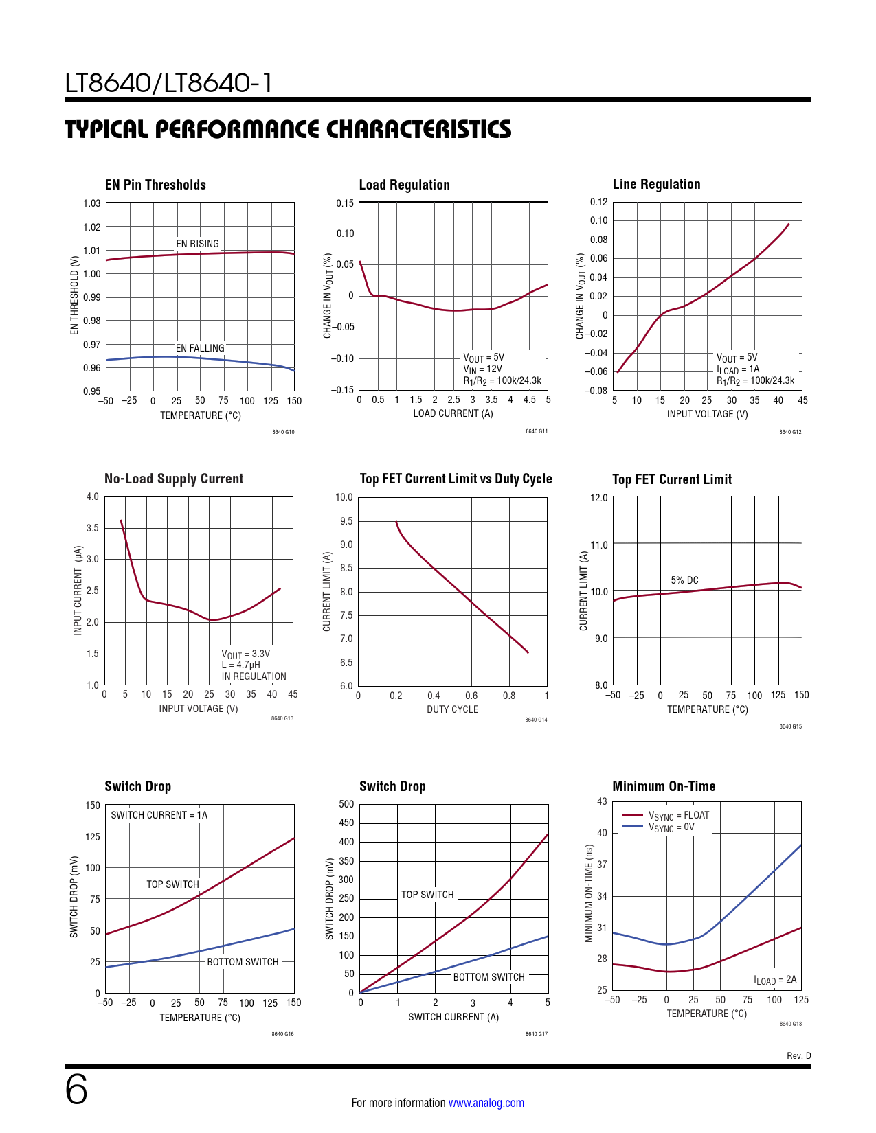 150 500 43 SWITCH CURRENT = 1A V 450 SYNC = FLOAT VSYNC = 0V 125 40 400 350 100 37 TOP SWITCH 300 75 250 TOP SWITCH 34 200 31 SWITCH DROP (mV) 50 SWITCH DROP (mV) 150 MINIMUM ON-TIME (ns) 100 25 BOTTOM SWITCH 28 50 BOTTOM SWITCH ILOAD = 2A 0 0 25 –50 –25 0 25 50 75 100 125 150 0 1 2 3 4 5 –50 –25 0 25 50 75 100 125 TEMPERATURE (°C) SWITCH CURRENT (A) TEMPERATURE (°C) 8640 G18 8640 G16 8640 G17 Rev. D 6 For more information www.analog.com Document Outline Features Applications Typical Application Description Absolute Maximum Ratings Order Information Pin Configuration Electrical Characteristics Typical Performance Characteristics Pin Functions Block Diagram Operation Applications Information Typical Applications Package Description Revision History Typical Application Related Parts