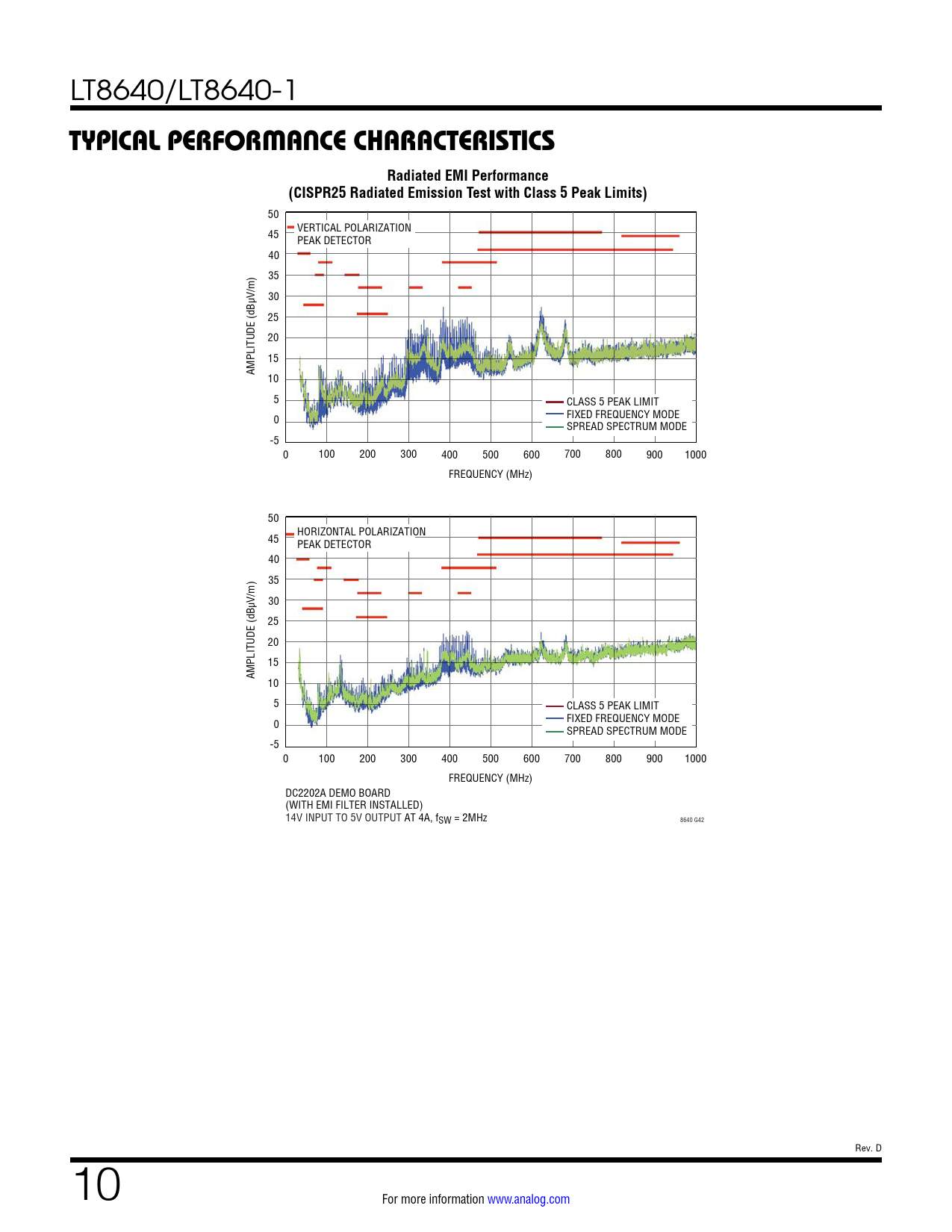 50 VERTICAL POLARIZATION 45 PEAK DETECTOR 40 35 30 25 20 15 AMPLITUDE (dBµV/m) 10 5 CLASS 5 PEAK LIMIT 0 FIXED FREQUENCY MODE SPREAD SPECTRUM MODE -5 0 100 200 300 400 500 600 700 800 900 1000 FREQUENCY (MHz) 50 HORIZONTAL POLARIZATION 45 PEAK DETECTOR 40 35 30 25 20 15 AMPLITUDE (dBµV/m) 10 5 CLASS 5 PEAK LIMIT 0 FIXED FREQUENCY MODE SPREAD SPECTRUM MODE -5 0 100 200 300 400 500 600 700 800 900 1000 FREQUENCY (MHz) DC2202A DEMO BOARD (WITH EMI FILTER INSTALLED) 14V INPUT TO 5V OUTPUT AT 4A, fSW = 2MHz 8640 G42 Rev. D 10 For more information www.analog.com Document Outline Features Applications Typical Application Description Absolute Maximum Ratings Order Information Pin Configuration Electrical Characteristics Typical Performance Characteristics Pin Functions Block Diagram Operation Applications Information Typical Applications Package Description Revision History Typical Application Related Parts