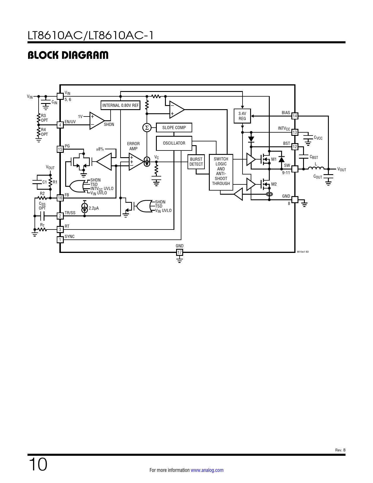 VIN VIN C 5, 6 IN – INTERNAL 0.80V REF + 3.4V BIAS R3 1V + REG 14 OPT EN/UV 4 – SHDN SLOPE COMP INTV R4 CC 13 OPT CVCC ERROR OSCILLATOR BST PG 15 ±8% AMP 12 + V C + C BURST SWITCH M1 BST V – DETECT LOGIC SW L OUT AND VOUT ANTI- 9-11 COUT SHOOT SHDN C1 R1 TSD THROUGH M2 INTVCC UVLO R2 VIN UVLO FB GND 16 SHDN CSS 8 TSD OPT 2.2µA VIN UVLO TR/SS 2 RT RT 3 SYNC 1 GND 8610ac1 BD 17 Rev. B 10 For more information www.analog.com Document Outline Features Applications Typical Application Description Absolute Maximum Ratings Order Information Electrical Characteristics Pin Configuration Typical Performance Characteristics Pin Functions Block Diagram Operation Applications Information Typical Applications Package Description Revision History Typical Application Related Parts