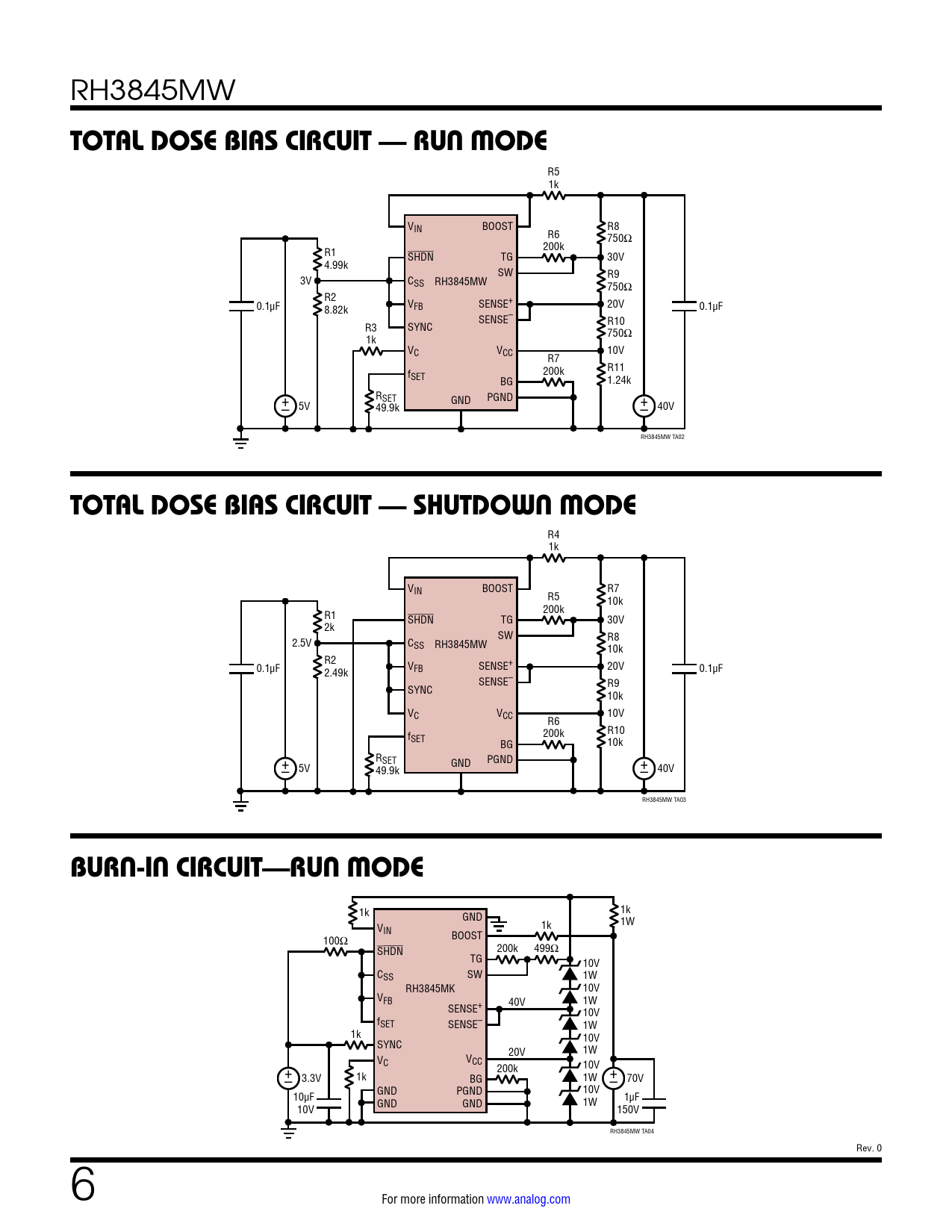 1k 1k GND V 1W IN 1k BOOST 100Ω SHDN 200k 499Ω TG 10V CSS SW 1W RH3845MK 10V VFB 40V 1W SENSE+ 10V fSET SENSE– 1W 1k 10V SYNC 20V 1W VC VCC + 200k 10V 3.3V 1k 1W + – BG – 70V GND PGND 10V 10µF 1µF GND GND 1W 10V 150V RH3845MW TA04 Rev. 0 6 For more information www.analog.com Document Outline Description Typical Application Absolute Maximum Ratings Package Information Table 1: Electrical characteristics Table 2: Electrical characteristics Electrical Characteristics: Burn-In Delta Parameters Electrical Test Requirements Total Dose Bias Circuit — Run Mode Total Dose Bias Circuit — Shutdown Mode Burn-In Circuit—Run Mode Package Description Typical Performance Characteristics