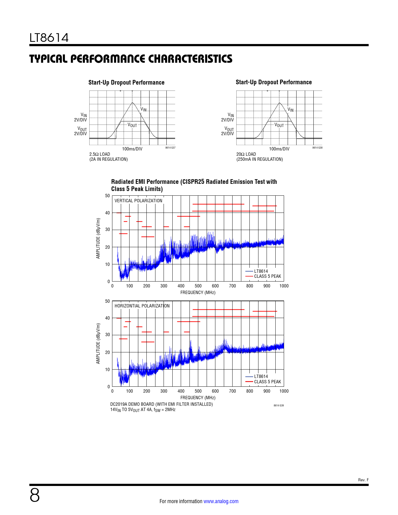 50 VERTICAL POLARIZATION 40 30 20 AMPLITUDE (dBµV/m) 10 LT8614 CLASS 5 PEAK 0 0 100 200 300 400 500 600 700 800 900 1000 FREQUENCY (MHz) 50 HORIZONTIAL POLARIZATION 40 30 20 AMPLITUDE (dBµV/m) 10 LT8614 CLASS 5 PEAK 0 0 100 200 300 400 500 600 700 800 900 1000 FREQUENCY (MHz) DC2019A DEMO BOARD (WITH EMI FILTER INSTALLED) 8614 G39 14VIN TO 5VOUT AT 4A, fSW = 2MHz Rev. F 8 For more information www.analog.com Document Outline Features Applications Typical Application Description Absolute Maximum Ratings Order Information Electrical Characteristics Pin Configuration Electrical Characteristics Typical Performance Characteristics Pin Functions Block Diagram Operation Applications Information Package Description Revision History Typical Applications Related Parts