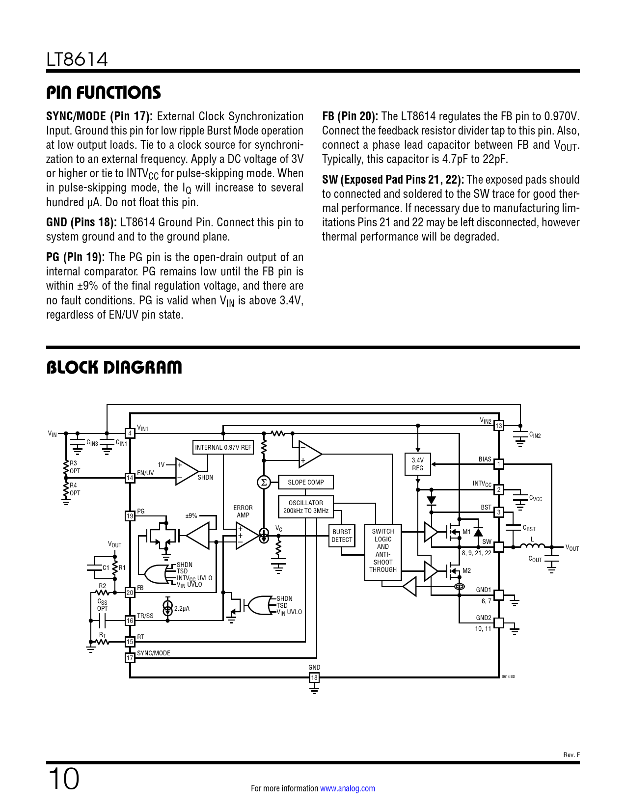 VIN2 V 13 IN1 VIN 4 CIN2 CIN3 CIN1 – INTERNAL 0.97V REF + 3.4V BIAS R3 1V + REG 1 OPT EN/UV 14 – SHDN SLOPE COMP INTV R4 CC 2 OPT C OSCILLATOR VCC ERROR PG 200kHz TO 3MHz BST 19 ±9% AMP 3 + V C + C BURST SWITCH M1 BST V – DETECT LOGIC SW L OUT AND VOUT ANTI- 8, 9, 21, 22 COUT SHOOT SHDN C1 R1 TSD THROUGH M2 INTVCC UVLO R2 VIN UVLO FB GND1 20 SHDN CSS 6, 7 TSD OPT 2.2µA VIN UVLO TR/SS GND2 16 10, 11 RT RT 15 SYNC/MODE 17 GND 8614 BD 18 Rev. F 10 For more information www.analog.com Document Outline Features Applications Typical Application Description Absolute Maximum Ratings Order Information Electrical Characteristics Pin Configuration Electrical Characteristics Typical Performance Characteristics Pin Functions Block Diagram Operation Applications Information Package Description Revision History Typical Applications Related Parts