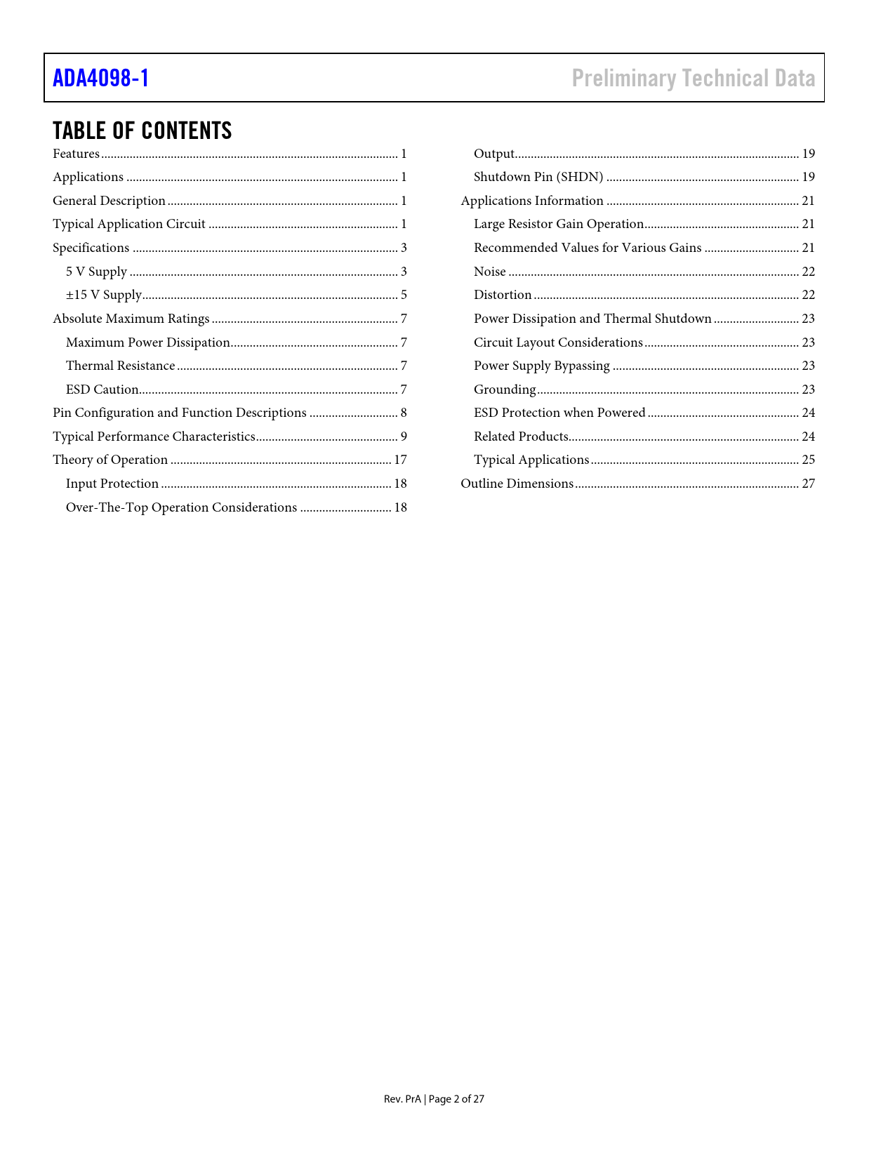 Pages / Page27 / 2 — ADA4098-1. Preliminary Technical Data. TABLE OF CONTENTS