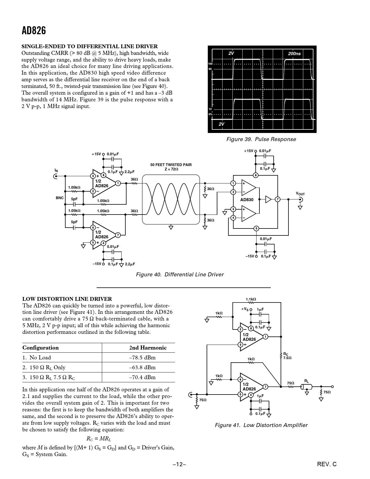 AD826SINGLE-ENDED TO DIFFERENTIAL LINE DRIVER Outstanding CMRR (> 80 dB @ 5 MHz), high bandwidth, wide 2V200ns supply voltage range, and the ability to drive heavy loads, make 100 the AD826 an ideal choice for many line driving applications. 90 In this application, the AD830 high speed video difference amp serves as the differential line receiver on the end of a back terminated, 50 ft., twisted-pair transmission line (see Figure 40). The overall system is configured in a gain of +1 and has a –3 dB bandwidth of 14 MHz. Figure 39 is the pulse response with a 2 V p-p, 1 MHz signal input. 100%2V Figure 39. Pulse Response 15V0.01F15V0.01F50 FEET TWISTED PAIRIZ = 720.1FN0.1F2.2F1/236AD8261.05k36VOUTBNC5pF1.05kAD8301.05k1.05k36365pF1/2 AD8260.01F0.01F–15V0.1F–15V0.1F2.2F Figure 40. Differential Line Driver LOW DISTORTION LINE DRIVER1.1k The AD826 can quickly be turned into a powerful, low distor- V tion line driver (see Figure 41). In this arrangement the AD826 S1F1k can comfortably drive a 75 Ω back-terminated cable, with a 5 MHz, 2 V p-p input; all of this while achieving the harmonic 0.1F distortion performance outlined in the following table. 1/2 AD826Configuration2nd HarmonicRC 1. No Load –78.5 dBm 7.51k 2. 150 Ω RL Only –63.8 dBm 3. 150 Ω R 1k L 7.5 Ω RC –70.4 dBm RL1/275 In this application one half of the AD826 operates at a gain of AD82675 2.1 and supplies the current to the load, while the other pro- 1F75 vides the overall system gain of 2. This is important for two reasons: the first is to keep the bandwidth of both amplifiers the 0.1F same, and the second is to preserve the AD826’s ability to oper- ate from low supply voltages. RC varies with the load and must Figure 41. Low Distortion Amplifier be chosen to satisfy the following equation: RC = MRL where M is defined by [(M+ 1) GS = GD] and GD = Driver’s Gain, GS = System Gain. –12– REV. C