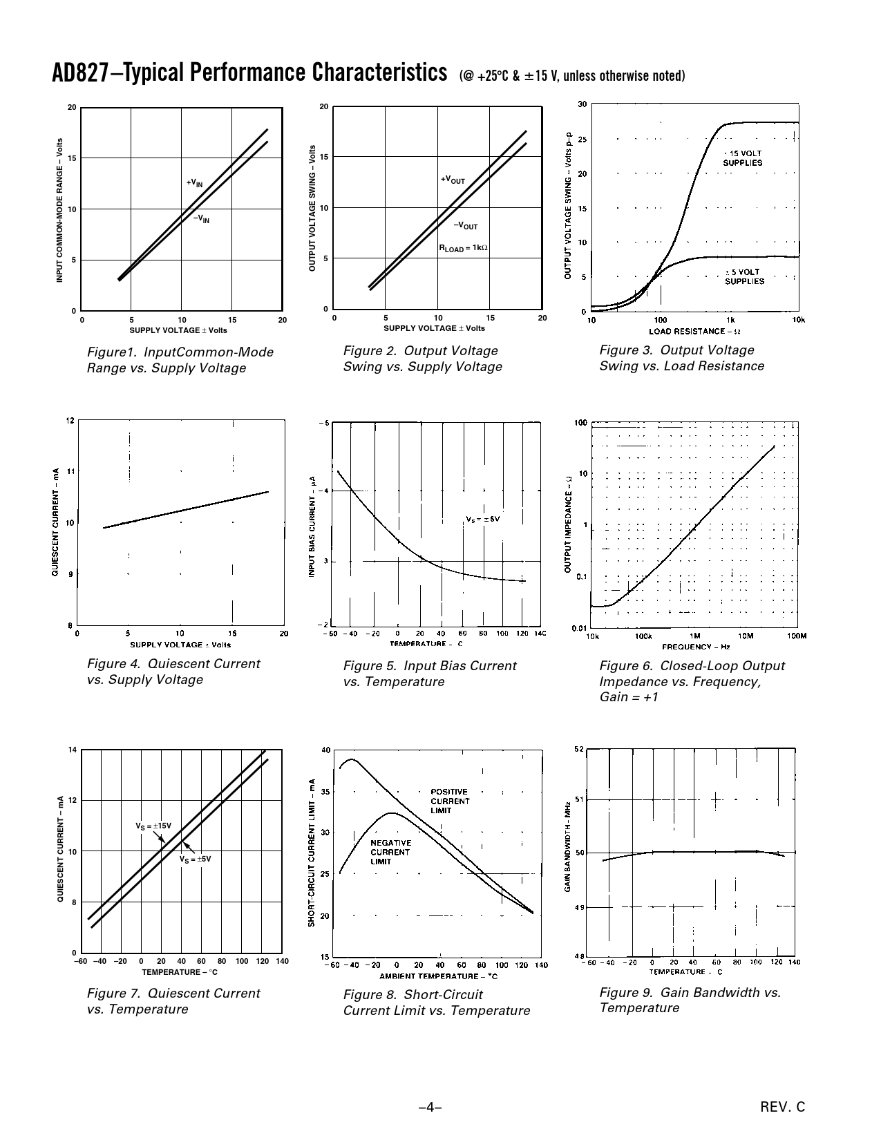 AD827–Typical Performance Characteristics (@ +25 ⴗ C & ⴞ 15 V, unless otherwise noted)20201515+V+VOUTIN1010–VIN–VOUTRLOAD = 1k Ω 55OUTPUT VOLTAGE SWING – VoltsINPUT COMMON-MODE RANGE – Volts000510152005101520SUPPLY VOLTAGE ± VoltsSUPPLY VOLTAGE ± Volts Figure1. InputCommon-Mode Figure 2. Output Voltage Figure 3. Output Voltage Range vs. Supply Voltage Swing vs. Supply Voltage Swing vs. Load Resistance Figure 4. Quiescent Current Figure 5. Input Bias Current Figure 6. Closed-Loop Output vs. Supply Voltage vs. Temperature Impedance vs. Frequency, Gain = +1 1412VS = ± 15V10VS = ± 5VQUIESCENT CURRENT – mA80–60 –40–20020406080100120 140TEMPERATURE – ° C Figure 7. Quiescent Current Figure 8. Short-Circuit Figure 9. Gain Bandwidth vs. vs. Temperature Current Limit vs. Temperature Temperature –4– REV. C Document Outline FEATURES CONNECTION DIAGRAMS PRODUCT DESCRIPTION APPLICATION HIGHLIGHTS SPECIFICATIONS ABSOLUTE MAXIMUM RATINGS ORDERING GUIDE METALLIZATION PHOTOGRAPH Typical Performance Characteristics INPUT PROTECTION PRECAUTIONS VIDEO LINE DRIVER A HIGH SPEED THREE OP AMP INSTRUMENTATION AMPLIFIER CIRCUIT A TWO-CHIP VOLTAGE-CONTROLLED AMPLIFIER (VCA) WITH EXPONENTIAL RESPONSE Guidelines for Grounding and Bypassing OUTLINE DIMENSIONS Revision History