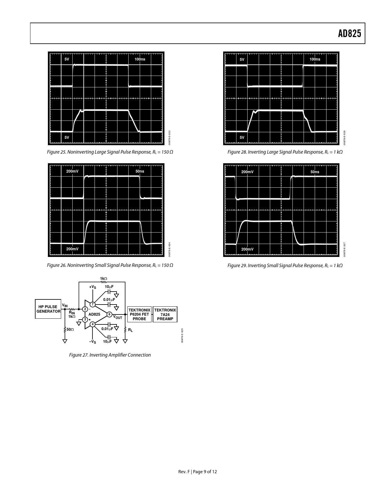 | Pages / Page | 12 / 9 — AD825. 100ns. 200mV. 50ns. +VS. 0.01. HP PULSE. TEKTRONIX. GENERATOR. … |