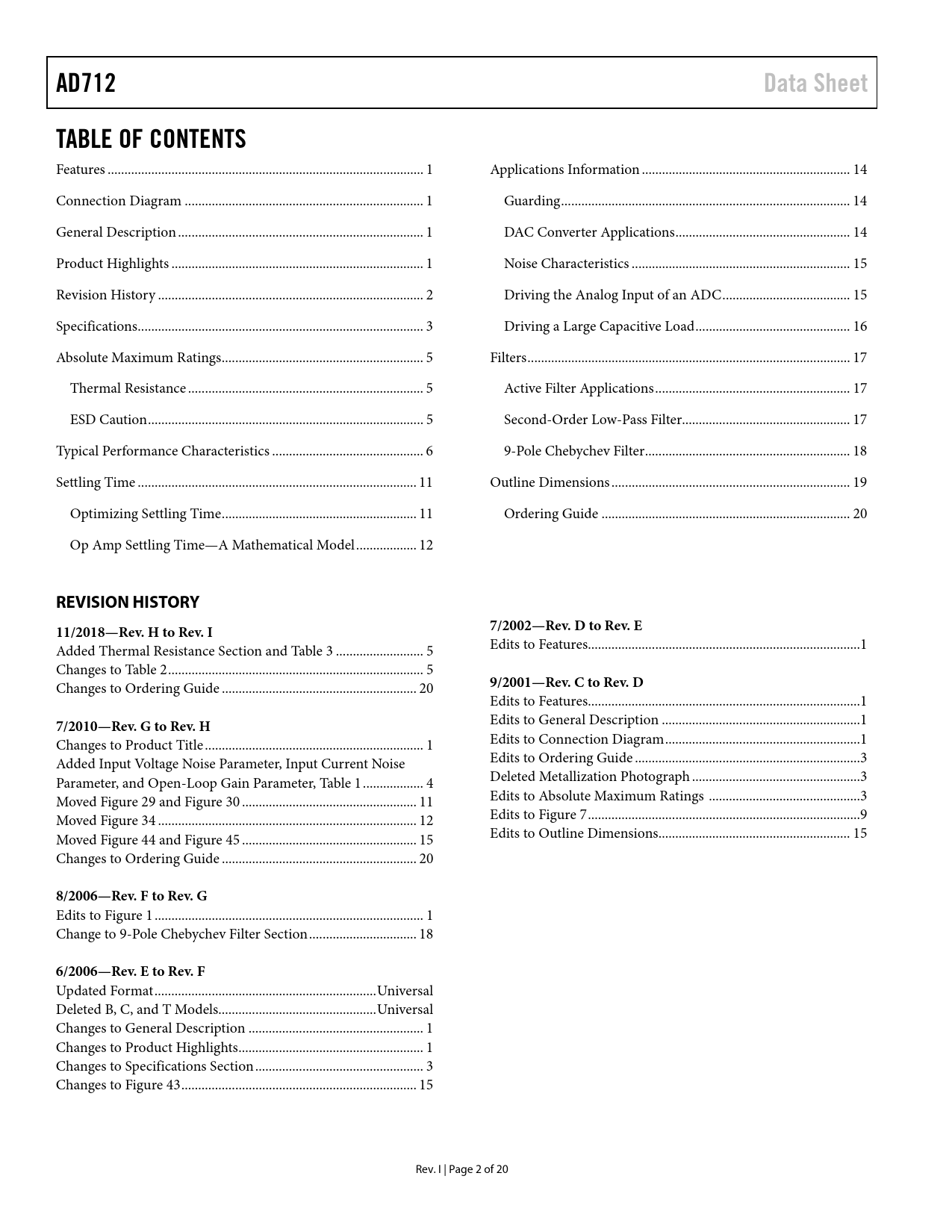 Pages / Page20 / 2 — AD712. Data Sheet. TABLE OF CONTENTS. REVISION HISTORY. 11/2018—Rev. H to …