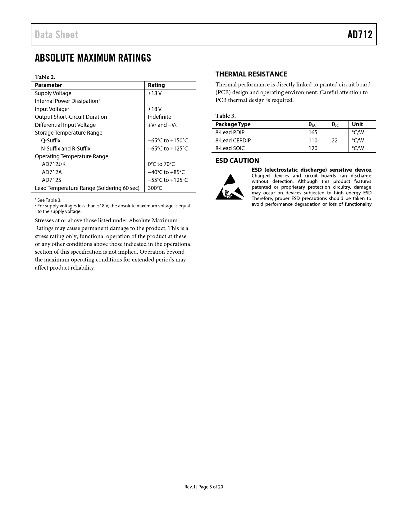 link to page 5 Data SheetAD712ABSOLUTE MAXIMUM RATINGSTable 2.THERMAL RESISTANCEParameterRating Thermal performance is directly linked to printed circuit board Supply Voltage ±18 V (PCB) design and operating environment. Careful attention to Internal Power Dissipation1 PCB thermal design is required. Input Voltage2 ±18 V Output Short-Circuit Duration Indefinite Table 3. Differential Input Voltage +VS and −VS Package TypeθJAθJCUnit Storage Temperature Range 8-Lead PDIP 165 °C/W Q-Suffix −65°C to +150°C 8-Lead CERDIP 110 22 °C/W N-Suffix and R-Suffix −65°C to +125°C 8-Lead SOIC 120 °C/W Operating Temperature Range ESD CAUTION AD712J/K 0°C to 70°C AD712A −40°C to +85°C AD712S −55°C to +125°C Lead Temperature Range (Soldering 60 sec) 300°C 1 See Table 3. 2 For supply voltages less than ±18 V, the absolute maximum voltage is equal to the supply voltage. Stresses at or above those listed under Absolute Maximum Ratings may cause permanent damage to the product. This is a stress rating only; functional operation of the product at these or any other conditions above those indicated in the operational section of this specification is not implied. Operation beyond the maximum operating conditions for extended periods may affect product reliability. Rev. I | Page 5 of 20 Document Outline FEATURES CONNECTION DIAGRAM GENERAL DESCRIPTION PRODUCT HIGHLIGHTS TABLE OF CONTENTS REVISION HISTORY SPECIFICATIONS ABSOLUTE MAXIMUM RATINGS THERMAL RESISTANCE ESD CAUTION TYPICAL PERFORMANCE CHARACTERISTICS SETTLING TIME OPTIMIZING SETTLING TIME OP AMP SETTLING TIME—A MATHEMATICAL MODEL APPLICATIONS INFORMATION GUARDING DAC CONVERTER APPLICATIONS NOISE CHARACTERISTICS DRIVING THE ANALOG INPUT OF AN ADC DRIVING A LARGE CAPACITIVE LOAD FILTERS ACTIVE FILTER APPLICATIONS SECOND-ORDER LOW-PASS FILTER 9-POLE CHEBYCHEV FILTER OUTLINE DIMENSIONS ORDERING GUIDE