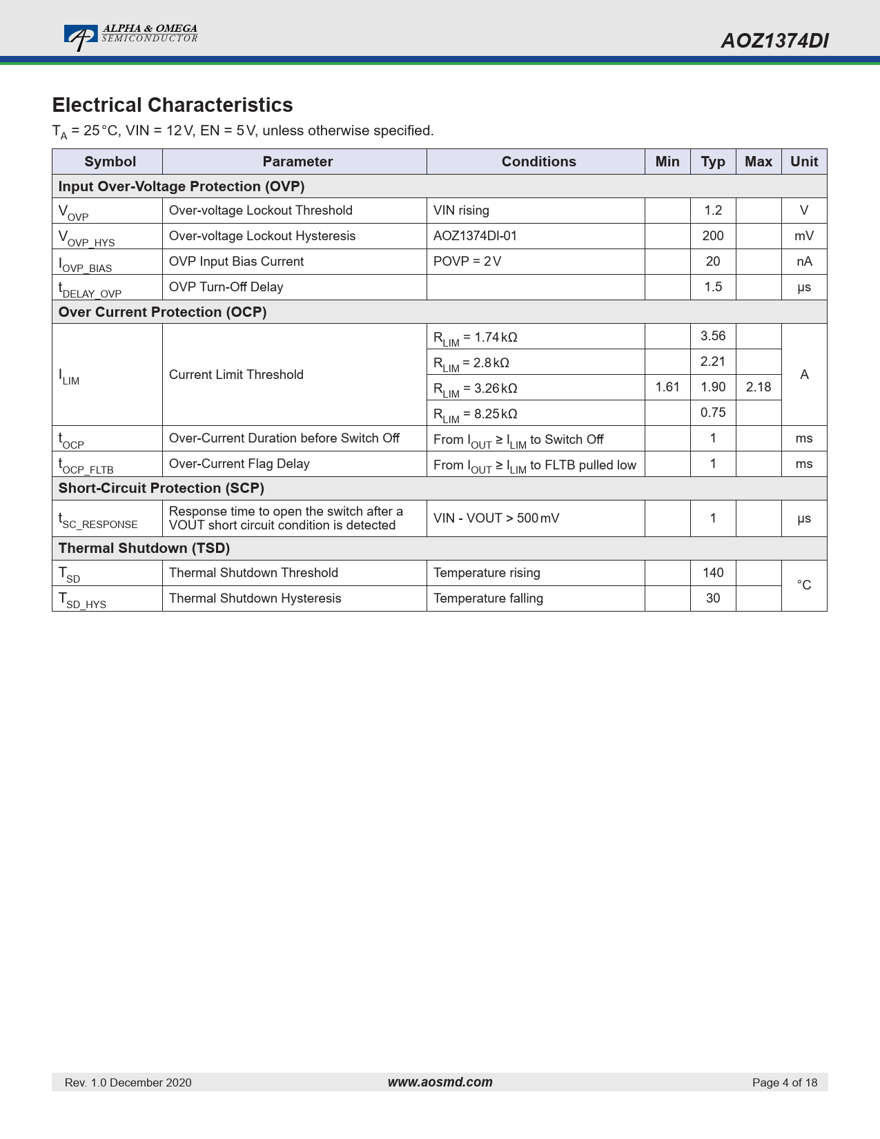 ALPHA & OMEGA S E M I C O N D U C T O R AOZ1374DIElectrical Characteristics TA = 25 °C, VIN = 12 V, EN = 5 V, unless otherwise specified. SymbolParameterConditionsMinTyp Max UnitInput Over-Voltage Protection (OVP) V Over-voltage Lockout Threshold VIN rising 1.2 V OVP V Over-voltage Lockout Hysteresis AOZ1374DI-01 200 mV OVP_HYS I OVP Input Bias Current POVP = 2 V 20 nA OVP_BIAS t OVP Turn-Off Delay 1.5 µs DELAY_OVP Over Current Protection (OCP) RLIM = 1.74 kΩ 3.56 R I Current Limit Threshold LIM = 2.8 kΩ 2.21 A LIM RLIM = 3.26 kΩ 1.61 1.90 2.18 RLIM = 8.25 kΩ 0.75 t Over-Current Duration before Switch Off OCP From IOUT ≥ ILIM to Switch Off 1 ms t Over-Current Flag Delay OCP_FLTB From IOUT ≥ ILIM to FLTB pulled low 1 ms Short-Circuit Protection (SCP) t Response time to open the switch after a SC_RESPONSE VOUT short circuit condition is detected VIN - VOUT > 500 mV 1 µs Thermal Shutdown (TSD) T Thermal Shutdown Threshold Temperature rising 140 SD °C T Thermal Shutdown Hysteresis Temperature falling 30 SD_HYS Rev. 1.0 December 2020 www.aosmd.com Page 4 of 18