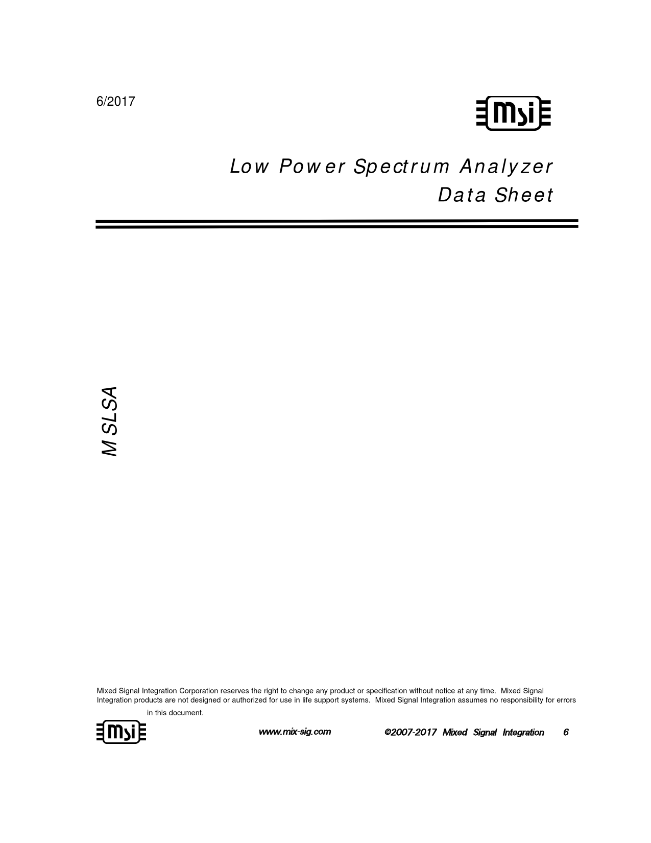 Mixed Signal Integration Corporation reserves the right to change any product or specification without notice at any time. Mixed Signal Integration products are not designed or authorized for use in life support systems. Mixed Signal Integration assumes no responsibility for errors in this document. www.mix-ssig.com ©2007-2 2017 Mixed Signal Integration 6