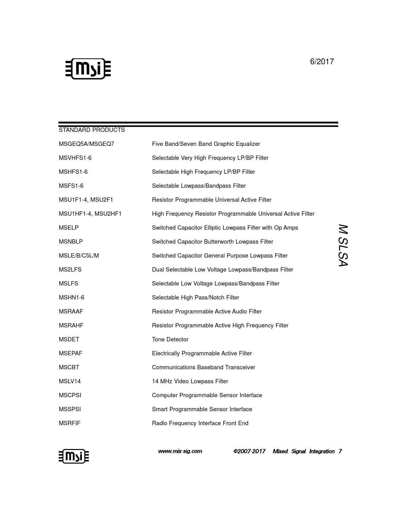 6/2017 STANDARD PRODUCTS MSGEQ5A/MSGEQ7 Five Band/Seven Band Graphic Equalizer MSVHFS1-6 Selectable Very High Frequency LP/BP Filter MSHFS1-6 Selectable High Frequency LP/BP Filter MSFS1-6 Selectable Lowpass/Bandpass Filter MSU1F1-4, MSU2F1 Resistor Programmable Universal Active Filter MSU1HF1-4, MSU2HF1 High Frequency Resistor Programmable Universal Active Filter