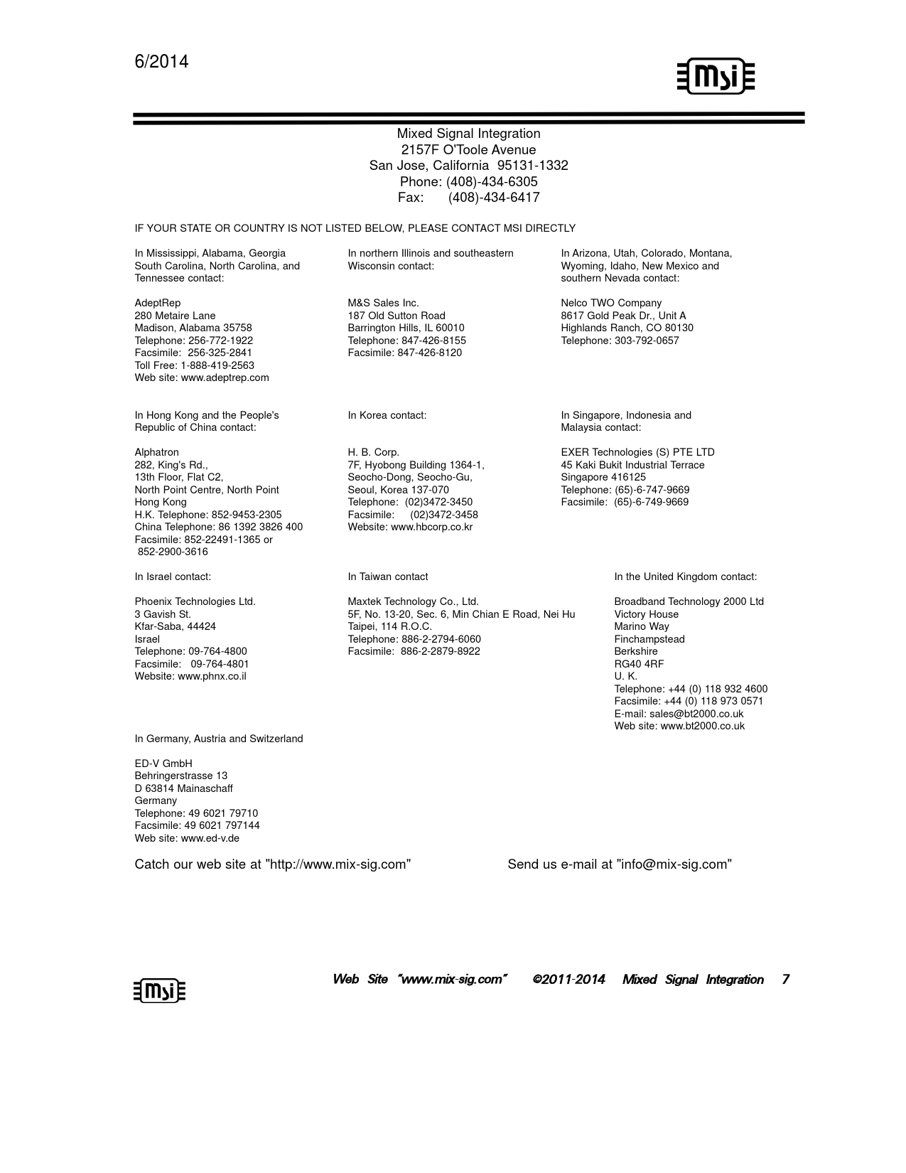6/2014 Mixed Signal Integration 2157F O'Toole Avenue San Jose, California 95131-1332 Phone: (408)-434-6305 Fax: (408)-434-6417 IF YOUR STATE OR COUNTRY IS NOT LISTED BELOW, PLEASE CONTACT MSI DIRECTLY In Mississippi, Alabama, Georgia In northern Illinois and southeastern In Arizona, Utah, Colorado, Montana, South Carolina, North Carolina, and Wisconsin contact: Wyoming, Idaho, New Mexico and Tennessee contact: southern Nevada contact: AdeptRep M&S Sales Inc. Nelco TWO Company 280 Metaire Lane 187 Old Sutton Road 8617 Gold Peak Dr., Unit A Madison, Alabama 35758 Barrington Hills, IL 60010 Highlands Ranch, CO 80130 Telephone: 256-772-1922 Telephone: 847-426-8155 Telephone: 303-792-0657 Facsimile: 256-325-2841 Facsimile: 847-426-8120 Toll Free: 1-888-419-2563 Web site: www.adeptrep.com In Hong Kong and the People's In Korea contact: In Singapore, Indonesia and Republic of China contact: Malaysia contact: Alphatron H. B. Corp. EXER Technologies (S) PTE LTD 282, King's Rd., 7F, Hyobong Building 1364-1, 45 Kaki Bukit Industrial Terrace 13th Floor, Flat C2, Seocho-Dong, Seocho-Gu, Singapore 416125 North Point Centre, North Point Seoul, Korea 137-070 Telephone: (65)-6-747-9669 Hong Kong Telephone: (02)3472-3450 Facsimile: (65)-6-749-9669 H.K. Telephone: 852-9453-2305 Facsimile: (02)3472-3458 China Telephone: 86 1392 3826 400 Website: www.hbcorp.co.kr Facsimile: 852-22491-1365 or 852-2900-3616 In Israel contact: In Taiwan contact In the United Kingdom contact: Phoenix Technologies Ltd. Maxtek Technology Co., Ltd. Broadband Technology 2000 Ltd 3 Gavish St. 5F, No. 13-20, Sec. 6, Min Chian E Road, Nei Hu Victory House Kfar-Saba, 44424 Taipei, 114 R.O.C. Marino Way Israel Telephone: 886-2-2794-6060 Finchampstead Telephone: 09-764-4800 Facsimile: 886-2-2879-8922 Berkshire Facsimile: 09-764-4801 RG40 4RF Website: www.phnx.co.il U. K. Telephone: +44 (0) 118 932 4600 Facsimile: +44 (0) 118 973 0571 E-mail: sales@bt2000.co.uk Web site: www.bt2000.co.uk In Germany, Austria and Switzerland ED-V GmbH Behringerstrasse 13 D 63814 Mainaschaff Germany Telephone: 49 6021 79710 Facsimile: 49 6021 797144 Web site: www.ed-v.de Catch our web site at "http://www.mix-sig.com" Send us e-mail at "info@mix-sig.com" Web Site “www.mix-ssig.com” ©2011-2 2014 Mixed Signal Integration 7