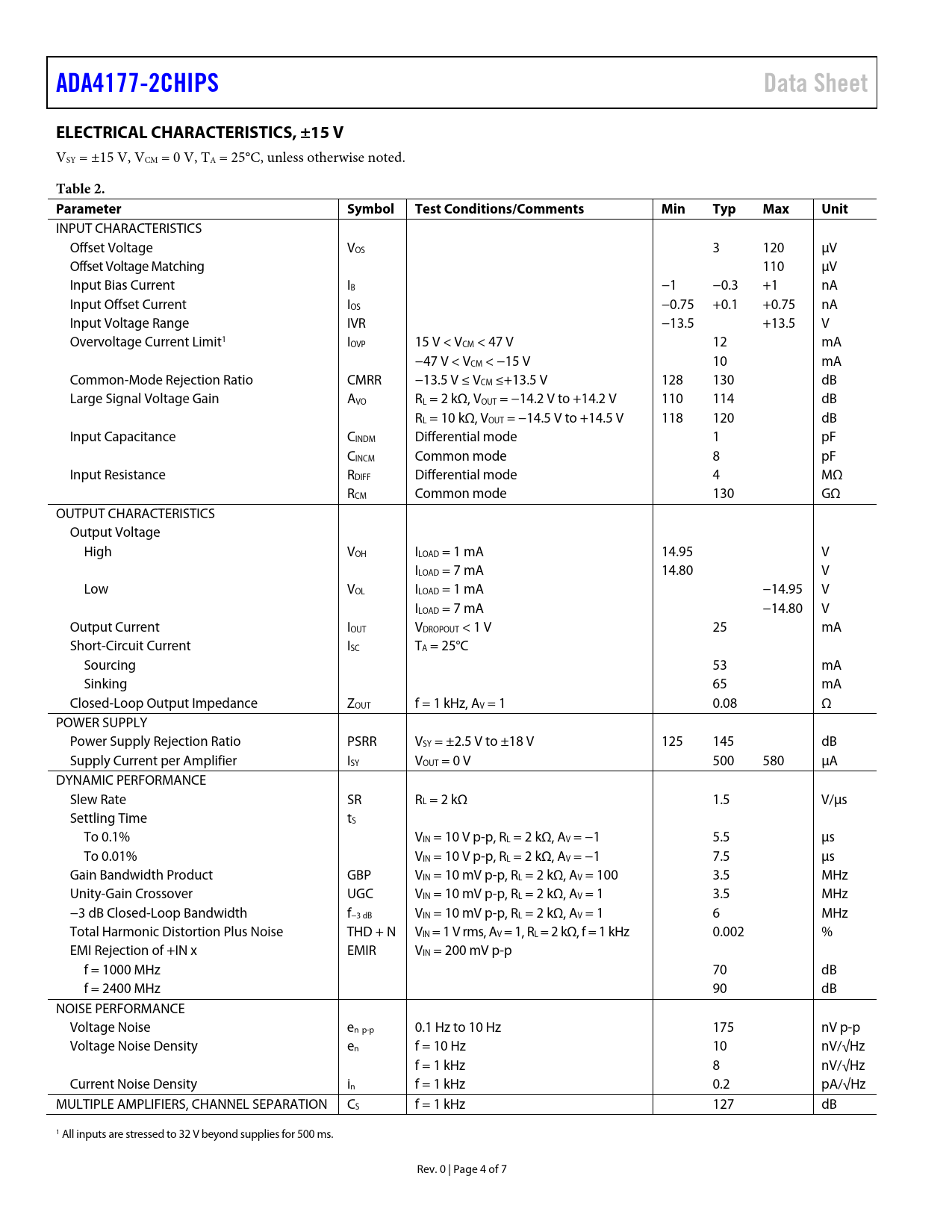 Pages / Page7 / 4 — ADA4177-2CHIPS. Data Sheet. ELECTRICAL CHARACTERISTICS, ±15 V. Table 2. …