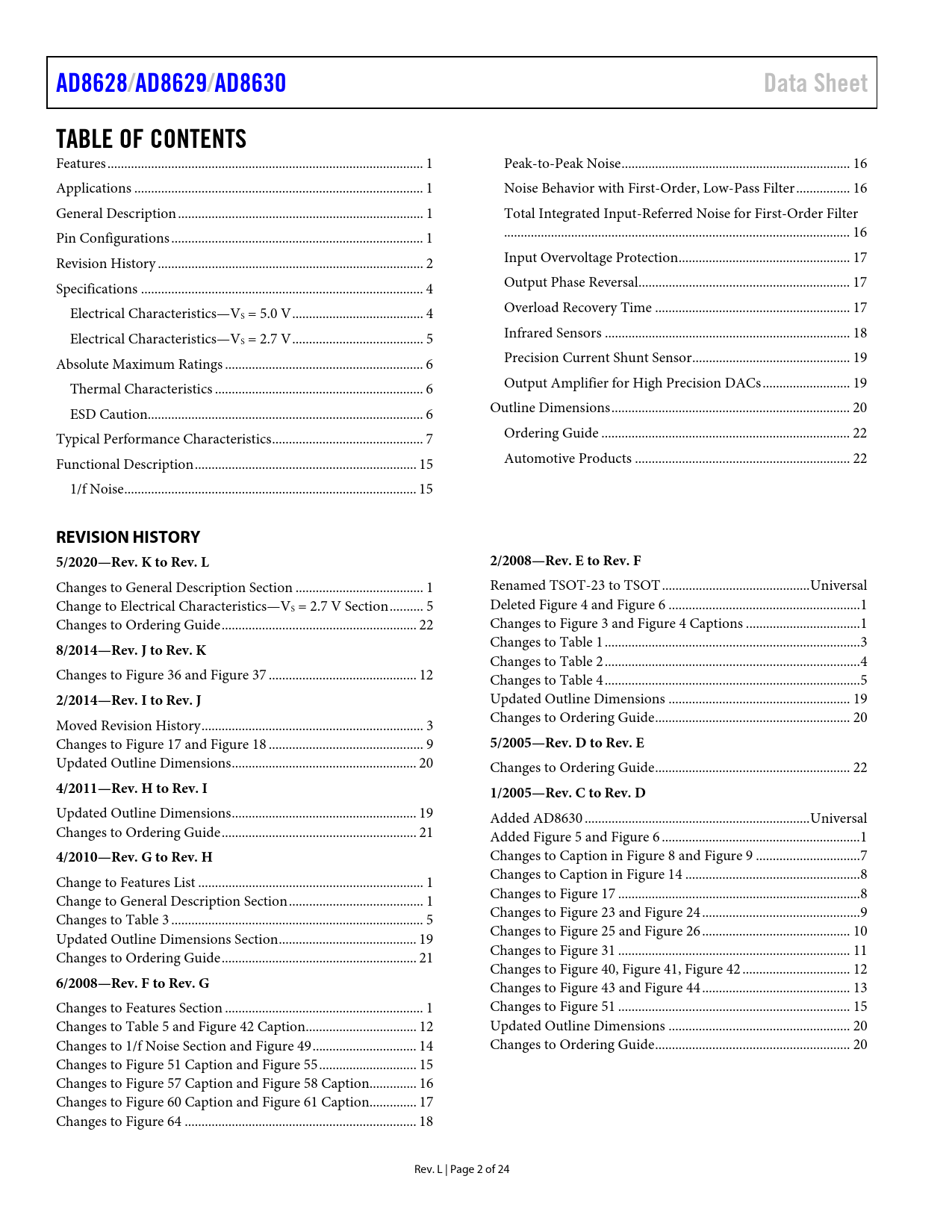AD8628/. AD8629/. AD8630. Data Sheet. TABLE OF CONTENTS. REVISION HISTORY. 5/2020—Rev. K to Rev. L. 2/2008—Rev. E to Rev. F