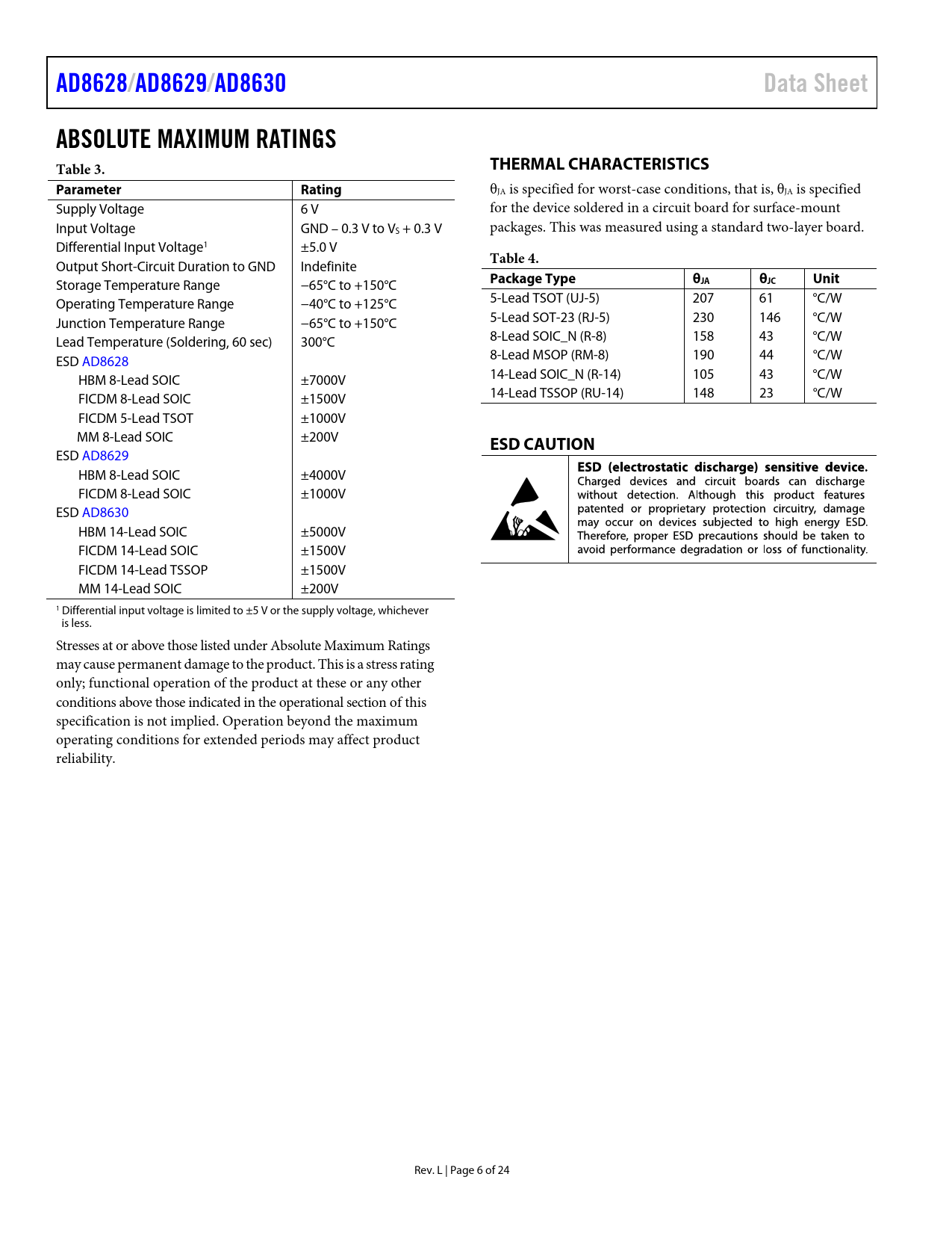 AD8628/ AD8629/ AD8630 Data Sheet ABSOLUTE MAXIMUM RATINGS Table 3. THERMAL CHARACTERISTICS Parameter Rating