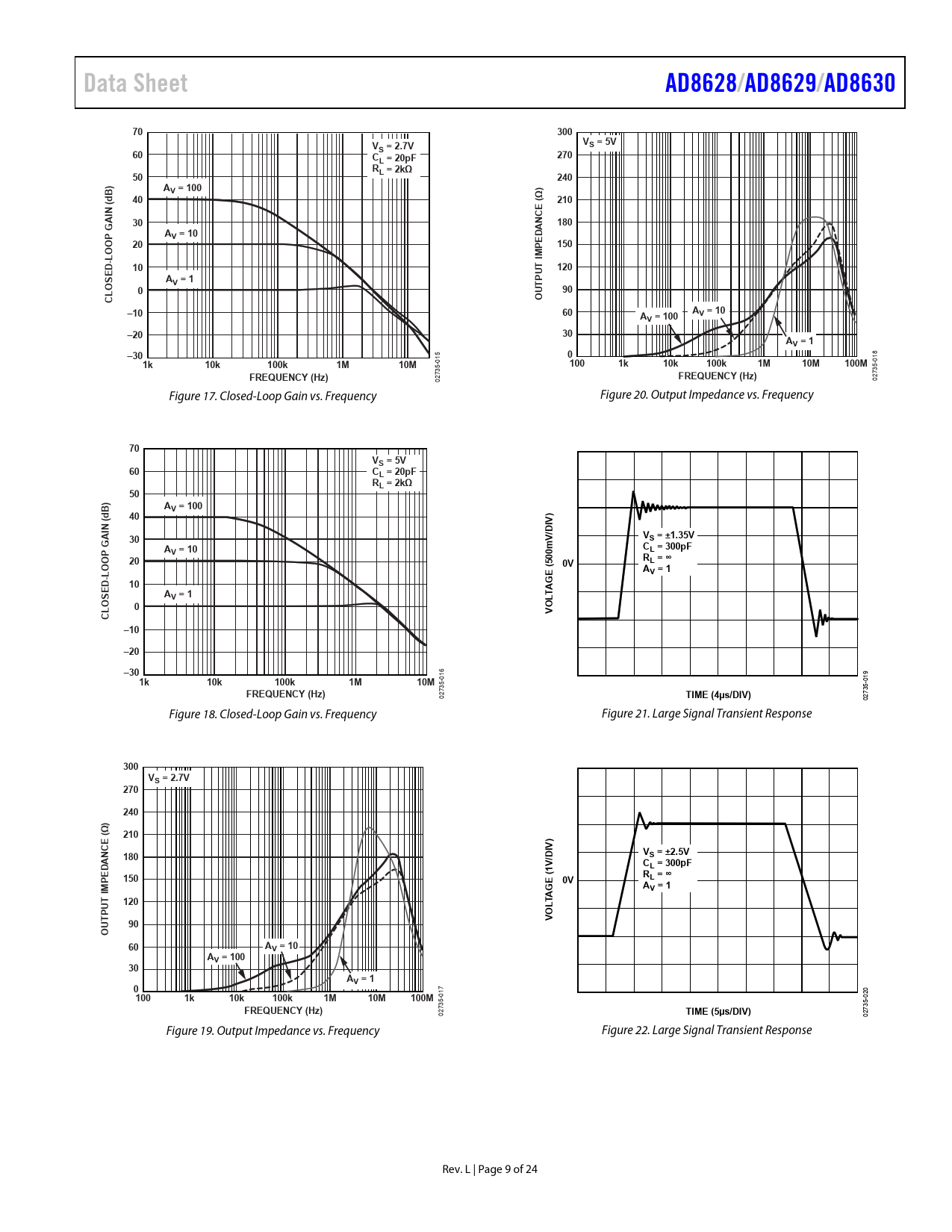 Data Sheet. AD8628/. AD8629/. AD8630. 300. VS = 5V. S = 2.7V. 270. L = 20pF. RL = 2kΩ. 240. ) B. AV = 100. 210. 180. ANCE. AV = 10. D E. 150. OO -L. 120. OSE