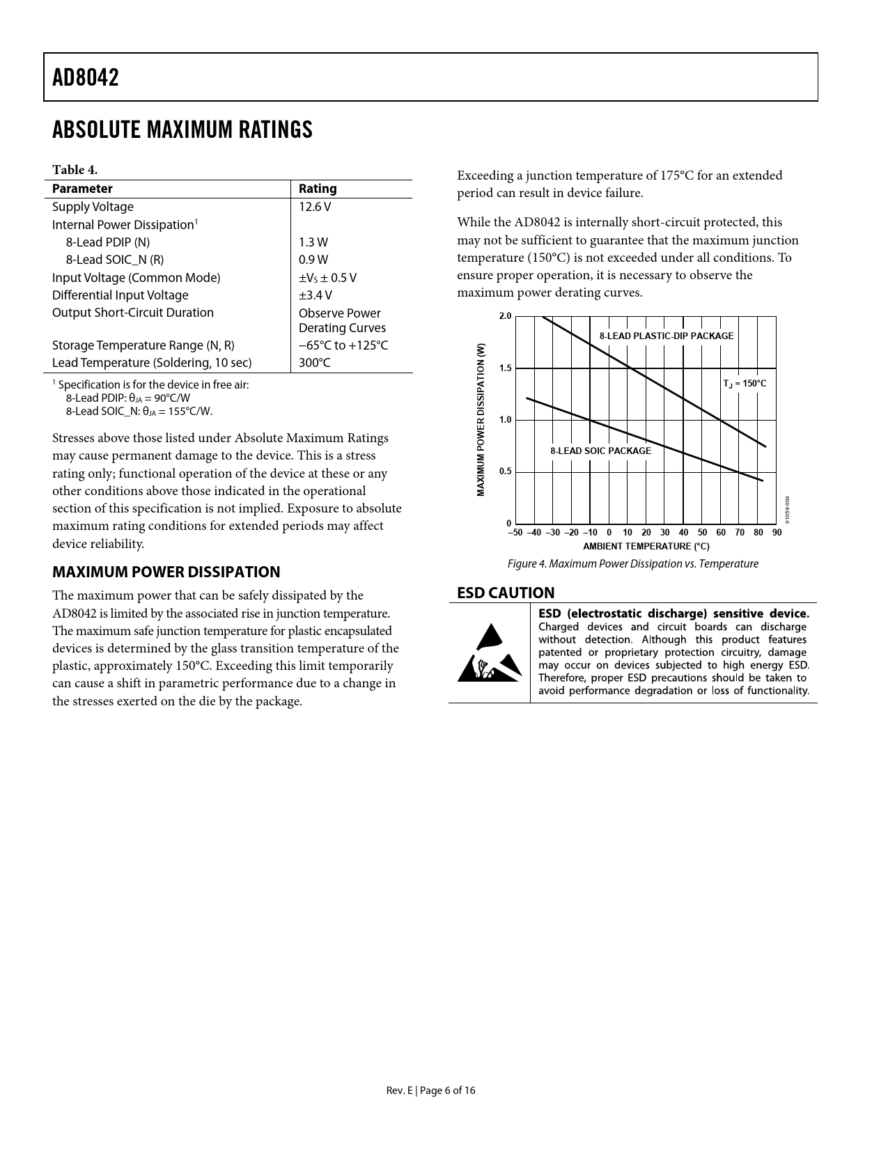 link to page 6 AD8042ABSOLUTE MAXIMUM RATINGSTable 4. Exceeding a junction temperature of 175°C for an extended Parameter Rating period can result in device failure. Supply Voltage 12.6 V Internal Power Dissipation1 While the AD8042 is internally short-circuit protected, this 8-Lead PDIP (N) 1.3 W may not be sufficient to guarantee that the maximum junction 8-Lead SOIC_N (R) 0.9 W temperature (150°C) is not exceeded under all conditions. To Input Voltage (Common Mode) ±V ensure proper operation, it is necessary to observe the S ± 0.5 V Differential Input Voltage ±3.4 V maximum power derating curves. Output Short-Circuit Duration Observe Power 2.0 Derating Curves 8-LEAD PLASTIC-DIP PACKAGE Storage Temperature Range (N, R) −65°C to +125°C ) W Lead Temperature (Soldering, 10 sec) 300°C N (1.5IO 1 Specification is for the device in free air: ATTJ = 150°CIP 8-Lead PDIP: θJA = 90°C/W S IS 8-Lead SOIC_N: θJA = 155°C/W. D R1.0E Stresses above those listed under Absolute Maximum Ratings W O may cause permanent damage to the device. This is a stress P8-LEAD SOIC PACKAGEUM rating only; functional operation of the device at these or any 0.5IM other conditions above those indicated in the operational AX M 4 section of this specification is not implied. Exposure to absolute -00 59 maximum rating conditions for extended periods may affect 0 010 –50 –40 –30 –20 –10 010 20 30 40 50 60 70 80 90 device reliability. AMBIENT TEMPERATURE (°C) Figure 4. Maximum Power Dissipation vs. Temperature MAXIMUM POWER DISSIPATION The maximum power that can be safely dissipated by the ESD CAUTION AD8042 is limited by the associated rise in junction temperature. The maximum safe junction temperature for plastic encapsulated devices is determined by the glass transition temperature of the plastic, approximately 150°C. Exceeding this limit temporarily can cause a shift in parametric performance due to a change in the stresses exerted on the die by the package. Rev. E | Page 6 of 16 Document Outline FEATURES APPLICATIONS GENERAL DESCRIPTION CONNECTION DIAGRAM TABLE OF CONTENTS REVISION HISTORY SPECIFICATIONS ABSOLUTE MAXIMUM RATINGS MAXIMUM POWER DISSIPATION ESD CAUTION TYPICAL PERFORMANCE CHARACTERISTICS APPLICATIONS INFORMATION CIRCUIT DESCRIPTION DRIVING CAPACITIVE LOADS OVERDRIVE RECOVERY Single-Supply Composite Video Line Driver Single-Ended-to-Differential Driver Single-Supply Differential A/D Driver HDSL Line Driver LAYOUT CONSIDERATIONS OUTLINE DIMENSIONS ORDERING GUIDE