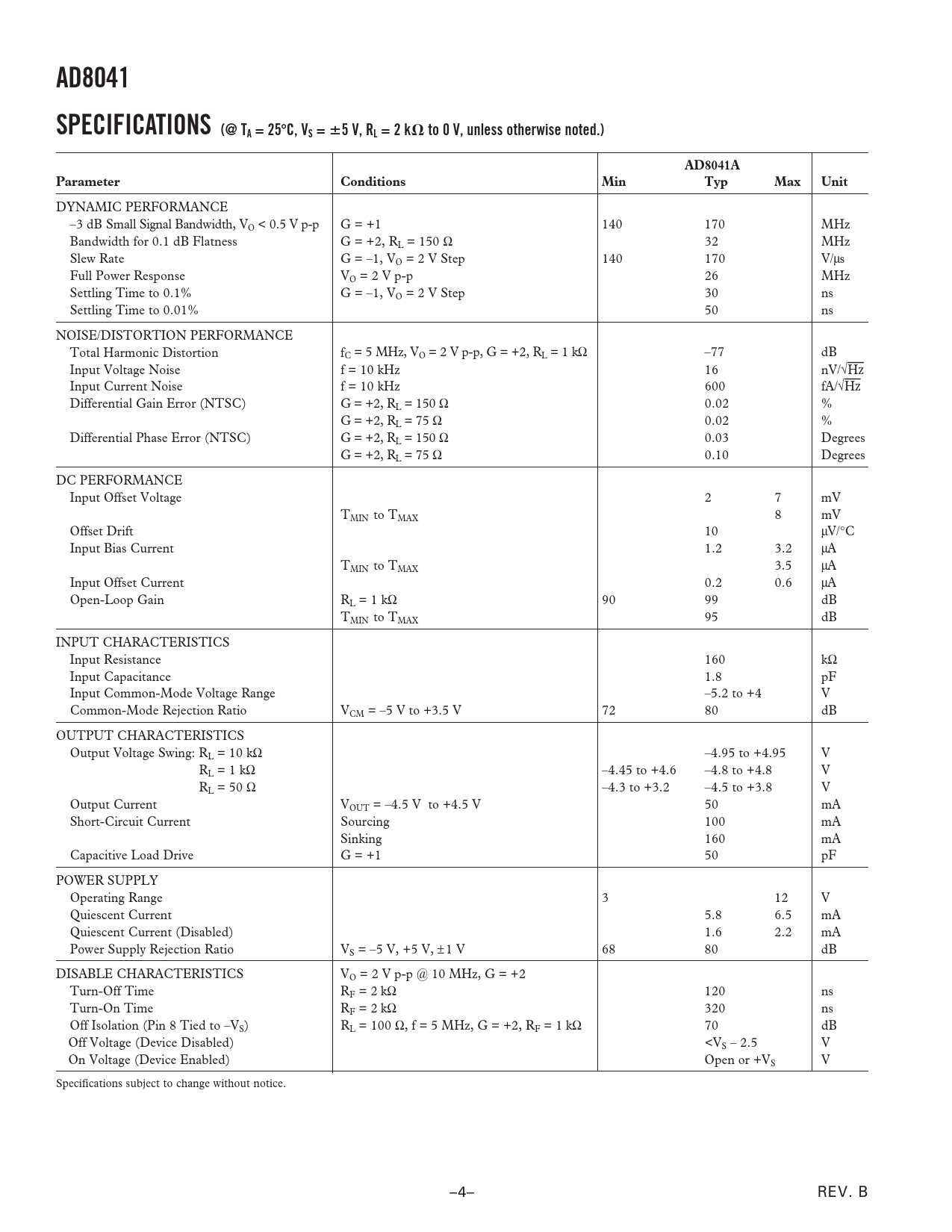 AD8041SPECIFICATIONS (@ TA = 25 ⴗ C, VS = ⴞ 5 V, RL = 2 k ⍀ to 0 V, unless otherwise noted.)AD8041AParameterConditionsMinTypMaxUnit DYNAMIC PERFORMANCE –3 dB Small Signal Bandwidth, VO < 0.5 V p-p G = +1 140 170 MHz Bandwidth for 0.1 dB Flatness G = +2, RL = 150 Ω 32 MHz Slew Rate G = –1, VO = 2 V Step 140 170 V/µs Full Power Response VO = 2 V p-p 26 MHz Settling Time to 0.1% G = –1, VO = 2 V Step 30 ns Settling Time to 0.01% 50 ns NOISE/DISTORTION PERFORMANCE Total Harmonic Distortion fC = 5 MHz, VO = 2 V p-p, G = +2, RL = 1 kΩ –77 dB Input Voltage Noise f = 10 kHz 16 nV/√Hz Input Current Noise f = 10 kHz 600 fA/√Hz Differential Gain Error (NTSC) G = +2, RL = 150 Ω 0.02 % G = +2, RL = 75 Ω 0.02 % Differential Phase Error (NTSC) G = +2, RL = 150 Ω 0.03 Degrees G = +2, RL = 75 Ω 0.10 Degrees DC PERFORMANCE Input Offset Voltage 2 7 mV TMIN to TMAX 8 mV Offset Drift 10 µV/°C Input Bias Current 1.2 3.2 µA TMIN to TMAX 3.5 µA Input Offset Current 0.2 0.6 µA Open-Loop Gain RL = 1 kΩ 90 99 dB TMIN to TMAX 95 dB INPUT CHARACTERISTICS Input Resistance 160 kΩ Input Capacitance 1.8 pF Input Common-Mode Voltage Range –5.2 to +4 V Common-Mode Rejection Ratio VCM = –5 V to +3.5 V 72 80 dB OUTPUT CHARACTERISTICS Output Voltage Swing: RL = 10 kΩ –4.95 to +4.95 V Output Voltage Swing: RL = 1 kΩ –4.45 to +4.6 –4.8 to +4.8 V Output Voltage Swing: RL = 50 Ω –4.3 to +3.2 –4.5 to +3.8 V Output Current VOUT = –4.5 V to +4.5 V 50 mA Short-Circuit Current Sourcing 100 mA Sinking 160 mA Capacitive Load Drive G = +1 50 pF POWER SUPPLY Operating Range 3 12 V Quiescent Current 5.8 6.5 mA Quiescent Current (Disabled) 1.6 2.2 mA Power Supply Rejection Ratio VS = –5 V, +5 V, ± 1 V 68 80 dB DISABLE CHARACTERISTICS VO = 2 V p-p @ 10 MHz, G = +2 Turn-Off Time RF = 2 kΩ 120 ns Turn-On Time RF = 2 kΩ 320 ns Off Isolation (Pin 8 Tied to –VS) RL = 100 Ω, f = 5 MHz, G = +2, RF = 1 kΩ 70 dB Off Voltage (Device Disabled) <VS – 2.5 V On Voltage (Device Enabled) Open or +VS V Specifications subject to change without notice. –4– REV. B Document Outline FEATURES APPLICATIONS PRODUCT DESCRIPTION CONNECTION DIAGRAM SPECIFICATIONS ABSOLUTE MAXIMUM RATINGS MAXIMUM POWER DISSIPATION ORDERING GUIDE Typical Performance Characteristics Overdrive Recovery Circuit Description Output Impedance Disable Operation Single-Supply A/D Conversion APPLICATIONS RGB Buffer Single-Supply Composite Video Line Driver Sync Stripper Layout Considerations OUTLINE DIMENSIONS Revision History