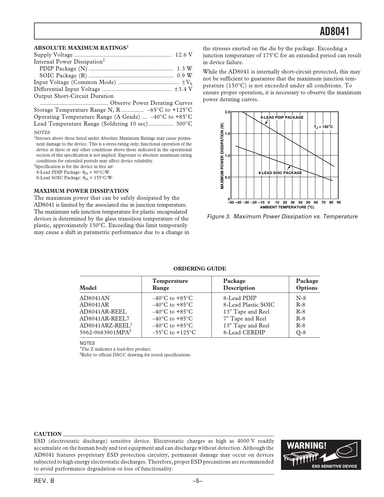 AD8041ABSOLUTE MAXIMUM RATINGS1 the stresses exerted on the die by the package. Exceeding a Supply Voltage .. 12.6 V junction temperature of 175°C for an extended period can result Internal Power Dissipation2 in device failure. PDIP Package (N) .. 1.3 W While the AD8041 is internally short-circuit protected, this may SOIC Package (R) .. 0.9 W not be sufficient to guarantee that the maximum junction tem- Input Voltage (Common Mode) .. ± VS perature (150°C) is not exceeded under all conditions. To Differential Input Voltage ... ± 3.4 V ensure proper operation, it is necessary to observe the maximum Output Short-Circuit Duration power derating curves. .. Observe Power Derating Curves Storage Temperature Range N, R .. –65°C to +125°C 2.0 Operating Temperature Range (A Grade) ... –40°C to +85°C 8-LEAD PDIP PACKAGE Lead Temperature Range (Soldering 10 sec) ... 300°C TJ = 150 ⴗ C NOTES 1.5 1Stresses above those listed under Absolute Maximum Ratings may cause perma- nent damage to the device. This is a stress rating only; functional operation of the device at these or any other conditions above those indicated in the operational section of this specification is not implied. Exposure to absolute maximum rating 1.0 conditions for extended periods may affect device reliability. 2Specification is for the device in free air: 8-Lead PDIP Package: θJA = 90°C/W. 8-LEAD SOIC PACKAGE 8-Lead SOIC Package: θ 0.5 JA = 155°C/W. MAXIMUM POWER DISSIPATION (W)MAXIMUM POWER DISSIPATION The maximum power that can be safely dissipated by the 0 AD8041 is limited by the associated rise in junction temperature. –50 –40 –30 –20 –10 01020 30405060 7080 90AMBIENT TEMPERATURE ( ⴗ C) The maximum safe junction temperature for plastic encapsulated devices is determined by the glass transition temperature of the Figure 3. Maximum Power Dissipation vs. Temperature plastic, approximately 150°C. Exceeding this limit temporarily may cause a shift in parametric performance due to a change in ORDERING GUIDETemperaturePackagePackageModelRangeDescriptionOptions AD8041AN –40°C to +85°C 8-Lead PDIP N-8 AD8041AR –40°C to +85°C 8-Lead Plastic SOIC R-8 AD8041AR-REEL –40°C to +85°C 13" Tape and Reel R-8 AD8041AR-REEL7 –40°C to +85°C 7" Tape and Reel R-8 AD8041ARZ-REEL1 –40°C to +85°C 13" Tape and Reel R-8 5962-9683901MPA2 –55°C to +125°C 8-Lead CERDIP Q-8 NOTES 1The Z indicates a lead-free product. 2Refer to official DSCC drawing for tested specifications. CAUTION ESD (electrostatic discharge) sensitive device. Electrostatic charges as high as 4000 V readily accumulate on the human body and test equipment and can discharge without detection. Although the AD8041 features proprietary ESD protection circuitry, permanent damage may occur on devices subjected to high energy electrostatic discharges. Therefore, proper ESD precautions are recommended to avoid performance degradation or loss of functionality. REV. B –5– Document Outline FEATURES APPLICATIONS PRODUCT DESCRIPTION CONNECTION DIAGRAM SPECIFICATIONS ABSOLUTE MAXIMUM RATINGS MAXIMUM POWER DISSIPATION ORDERING GUIDE Typical Performance Characteristics Overdrive Recovery Circuit Description Output Impedance Disable Operation Single-Supply A/D Conversion APPLICATIONS RGB Buffer Single-Supply Composite Video Line Driver Sync Stripper Layout Considerations OUTLINE DIMENSIONS Revision History