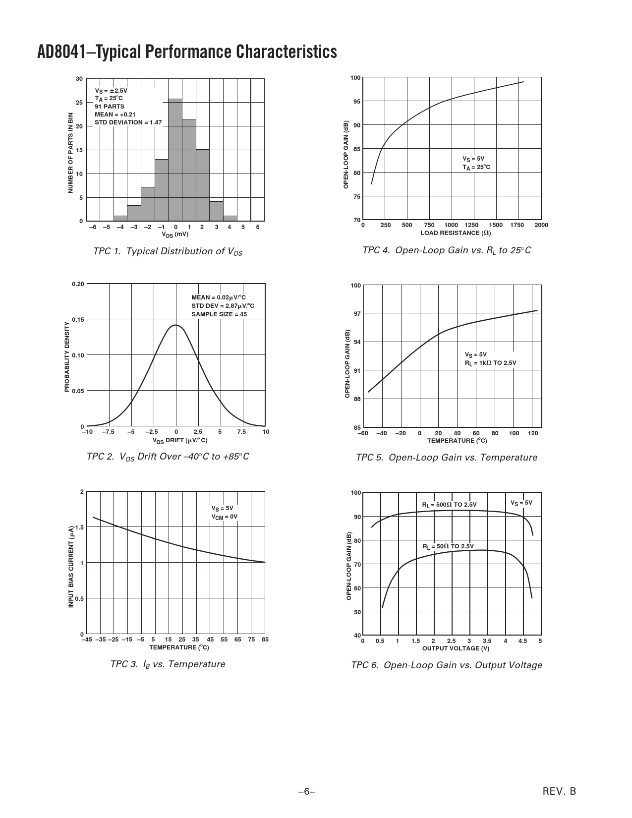 AD8041–Typical Performance Characteristics30100VS = ⴞ 2.5V T25A = 25 ⴗ C9591 PARTS MEAN = +0.21 STD DEVIATION = 1.4720901585VS = 5V TA = 25 ⴗ C1080OPEN-LOOP GAIN (dB)NUMBER OF PARTS IN BIN575070–6–5–4–3–2–10123456025050075010001250150017502000VLOAD RESISTANCE ( ⍀ )OS (mV) TPC 1. Typical Distribution of V TPC 4. Open-Loop Gain vs. R OS L to 25°C 0.20100MEAN = 0.02 V/ ⴗ C STD DEV = 2.87 V/ ⴗ C SAMPLE SIZE = 45970.15940.10VS = 5V RL = 1k ⍀ TO 2.5V91PROBABILITY DENSITY 0.05OPEN-LOOP GAIN (dB) 88085–10–7.5–5–2.502.557.510–60–40–20020406080100120VOS DRIFT ( V/ ⴗ C)TEMPERATURE ( ⴗ C) TPC 2. VOS Drift Over –40°C to +85°C TPC 5. Open-Loop Gain vs. Temperature 2100RVL = 500 ⍀ TO 2.5VVS = 5VS = 5VVCM = 0V901.5A) 80RL = 50 ⍀ TO 2.5V170600.5OPEN-LOOP GAIN (dB)INPUT BIAS CURRENT (50040–45 –35 –25 –15 –55152535455565758500.511.522.533.544.55TEMPERATURE ( ⴗ C)OUTPUT VOLTAGE (V) TPC 3. IB vs. Temperature TPC 6. Open-Loop Gain vs. Output Voltage –6– REV. B Document Outline FEATURES APPLICATIONS PRODUCT DESCRIPTION CONNECTION DIAGRAM SPECIFICATIONS ABSOLUTE MAXIMUM RATINGS MAXIMUM POWER DISSIPATION ORDERING GUIDE Typical Performance Characteristics Overdrive Recovery Circuit Description Output Impedance Disable Operation Single-Supply A/D Conversion APPLICATIONS RGB Buffer Single-Supply Composite Video Line Driver Sync Stripper Layout Considerations OUTLINE DIMENSIONS Revision History