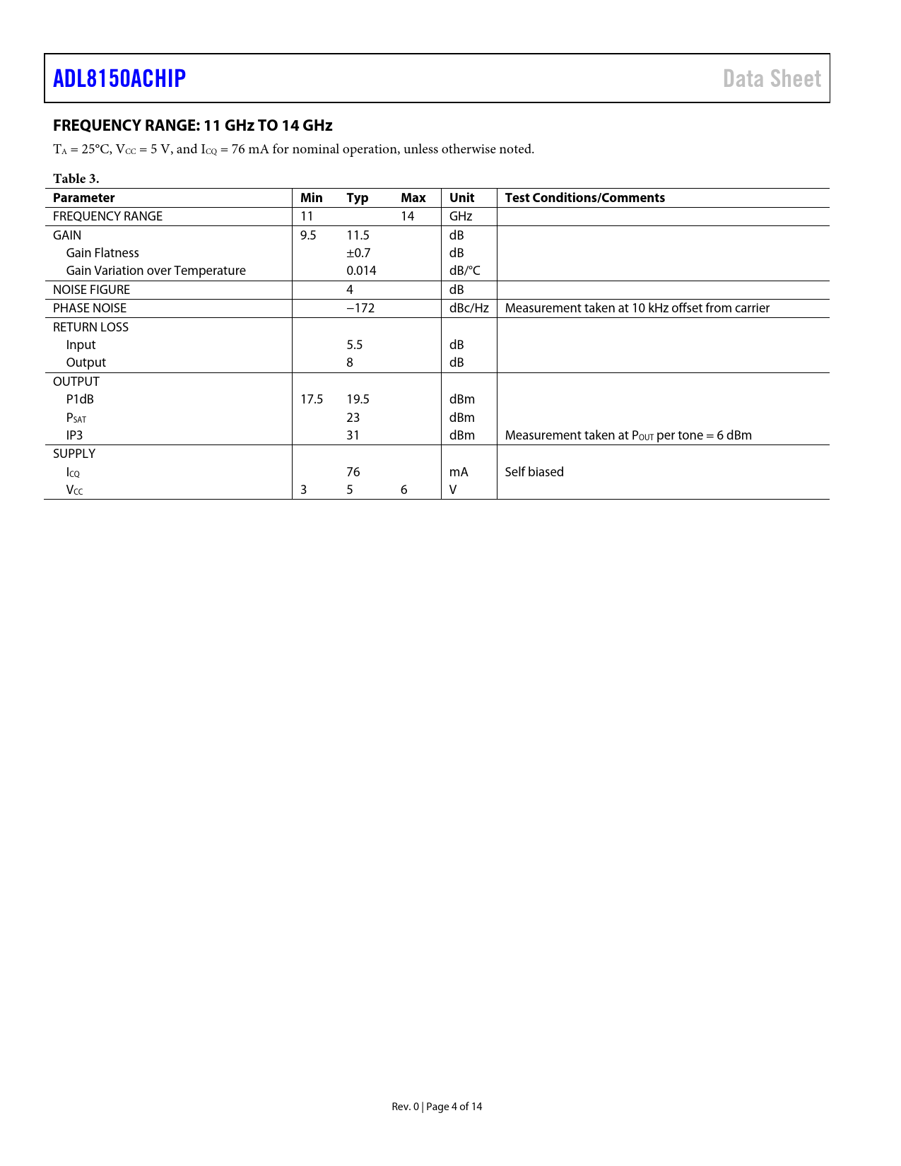 ADL8150ACHIP. Data Sheet. FREQUENCY RANGE: 11 GHz TO 14 GHz. Table 3. Parameter. Min. Typ. Max. Unit. Test Conditions/Comments