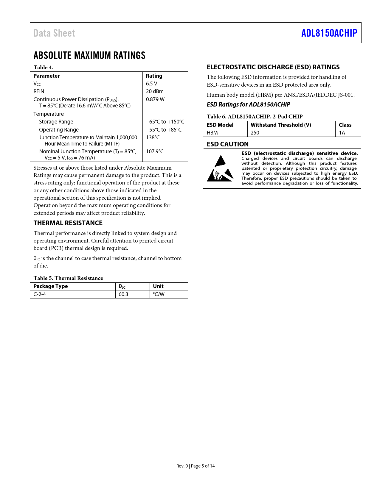 Data SheetADL8150ACHIPABSOLUTE MAXIMUM RATINGS Table 4.ELECTROSTATIC DISCHARGE (ESD) RATINGSParameterRating The following ESD information is provided for handling of VCC 6.5 V ESD-sensitive devices in an ESD protected area only. RFIN 20 dBm Human body model (HBM) per ANSI/ESDA/JEDDEC JS-001. Continuous Power Dissipation (PDISS), 0.879 W T = 85°C (Derate 16.6 mW/°C Above 85°C) ESD Ratings for ADL8150ACHIP Temperature Table 6. ADL8150ACHIP, 2-Pad CHIP Storage Range −65°C to +150°C ESD ModelWithstand Threshold (V)Class Operating Range −55°C to +85°C HBM 250 1A Junction Temperature to Maintain 1,000,000 138°C Hour Mean Time to Failure (MTTF) ESD CAUTION Nominal Junction Temperature (TJ = 85°C, 107.9°C VCC = 5 V, ICQ = 76 mA) Stresses at or above those listed under Absolute Maximum Ratings may cause permanent damage to the product. This is a stress rating only; functional operation of the product at these or any other conditions above those indicated in the operational section of this specification is not implied. Operation beyond the maximum operating conditions for extended periods may affect product reliability. THERMAL RESISTANCE Thermal performance is directly linked to system design and operating environment. Careful attention to printed circuit board (PCB) thermal design is required. θJC is the channel to case thermal resistance, channel to bottom of die. Table 5. Thermal Resistance Package TypeθJCUnit C-2-4 60.3 °C/W Rev. 0 | Page 5 of 14 Document Outline Features Applications Functional Block Diagram General Description Revision History Specifications Frequency Range: 6 GHz to 7 GHz Frequency Range: 7 GHz to 11 GHz Frequency Range: 11 GHz to 14 GHz Absolute Maximum Ratings Thermal Resistance Electrostatic Discharge (ESD) Ratings ESD Ratings for ADL8150ACHIP ESD Caution Pin Configuration and Function Descriptions Interface Schematics Typical Performance Characteristics Theory of Operation Applications Information Biasing Procedures Handling Precautions Mounting Wire Bonding Assembly and Typical Application Circuit Diagrams Outline Dimensions Ordering Guide