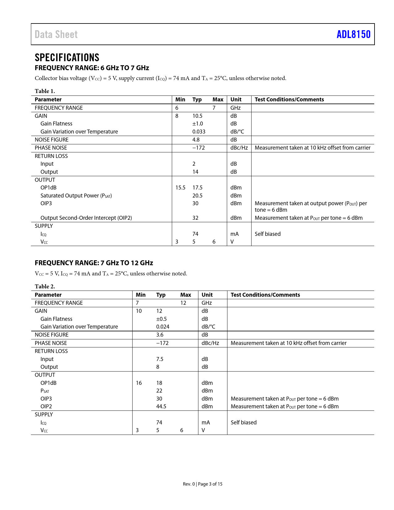 Pages / Page15 / 3 — Data Sheet. ADL8150. SPECIFICATIONS FREQUENCY RANGE: 6 GHz TO 7 GHz. …