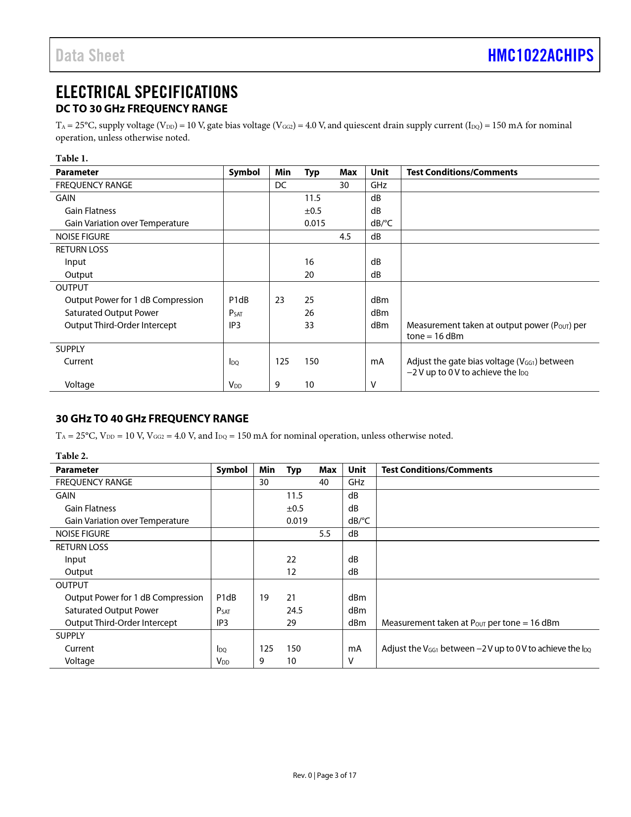 Data Sheet. HMC1022ACHIPS. ELECTRICAL SPECIFICATIONS. DC TO 30 GHz FREQUENCY RANGE. Table 1. Parameter. Symbol. Min. Typ. Max. Unit
