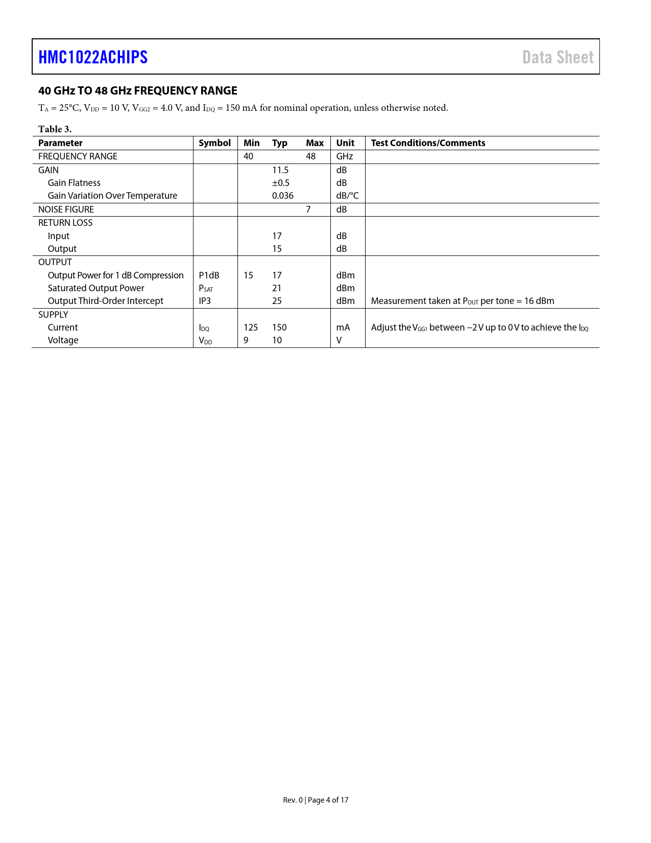 Pages / Page17 / 4 — HMC1022ACHIPS. Data Sheet. 40 GHz TO 48 GHz FREQUENCY RANGE. Table 3. …