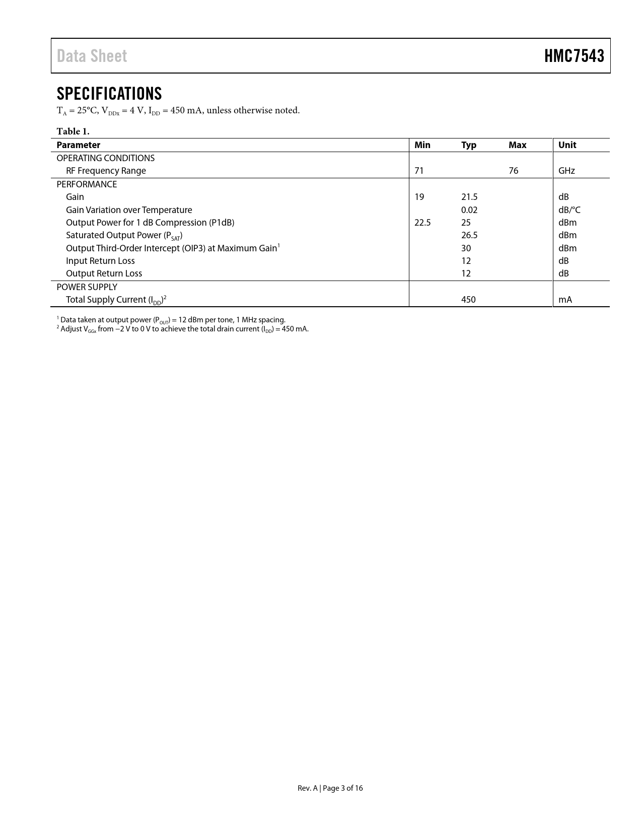 Pages / Page16 / 3 — Data Sheet. HMC7543. SPECIFICATIONS. Table 1. Parameter. Min. Typ. Max. …