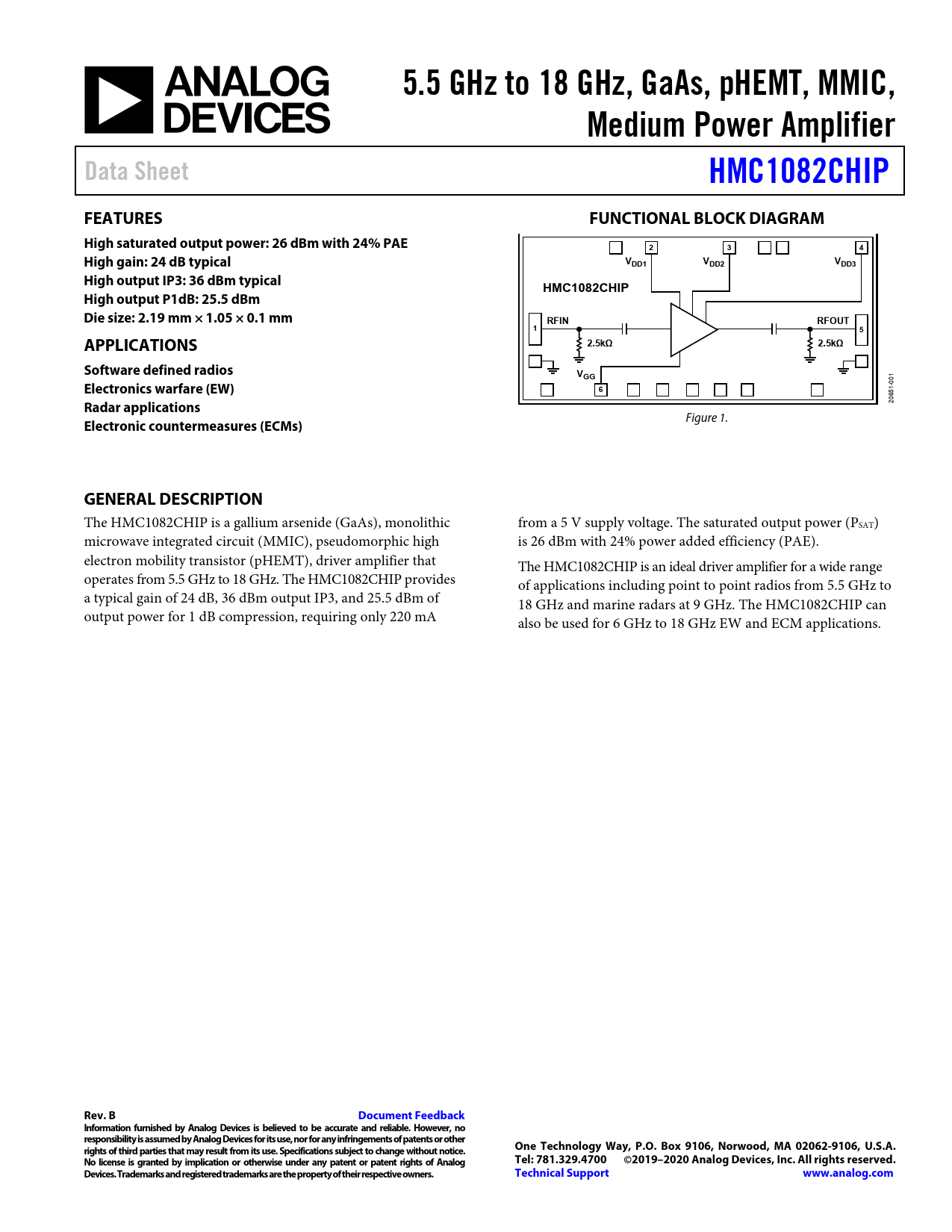 5.5 GHz to 18 GHz, GaAs, pHEMT, MMIC,. Medium Power Amplifier. Data Sheet. HMC1082CHIP. FEATURES. FUNCTIONAL BLOCK DIAGRAM