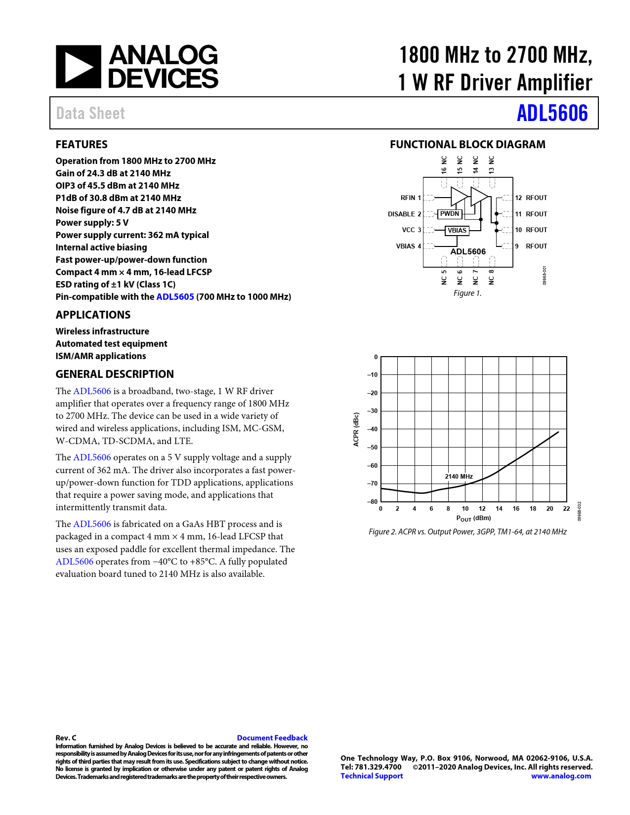 1800 MHz to 2700 MHz,. 1 W RF Driver Amplifier. Data Sheet. ADL5606. FEATURES. FUNCTIONAL BLOCK DIAGRAM