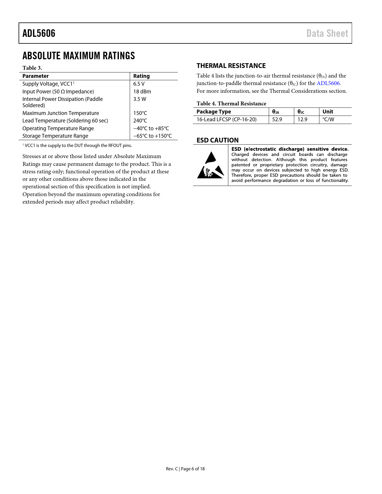 ADL5606 Data Sheet ABSOLUTE MAXIMUM RATINGS Table 3 THERMAL RESISTANCE Parameter Rating Table 4 Thermal Resistance