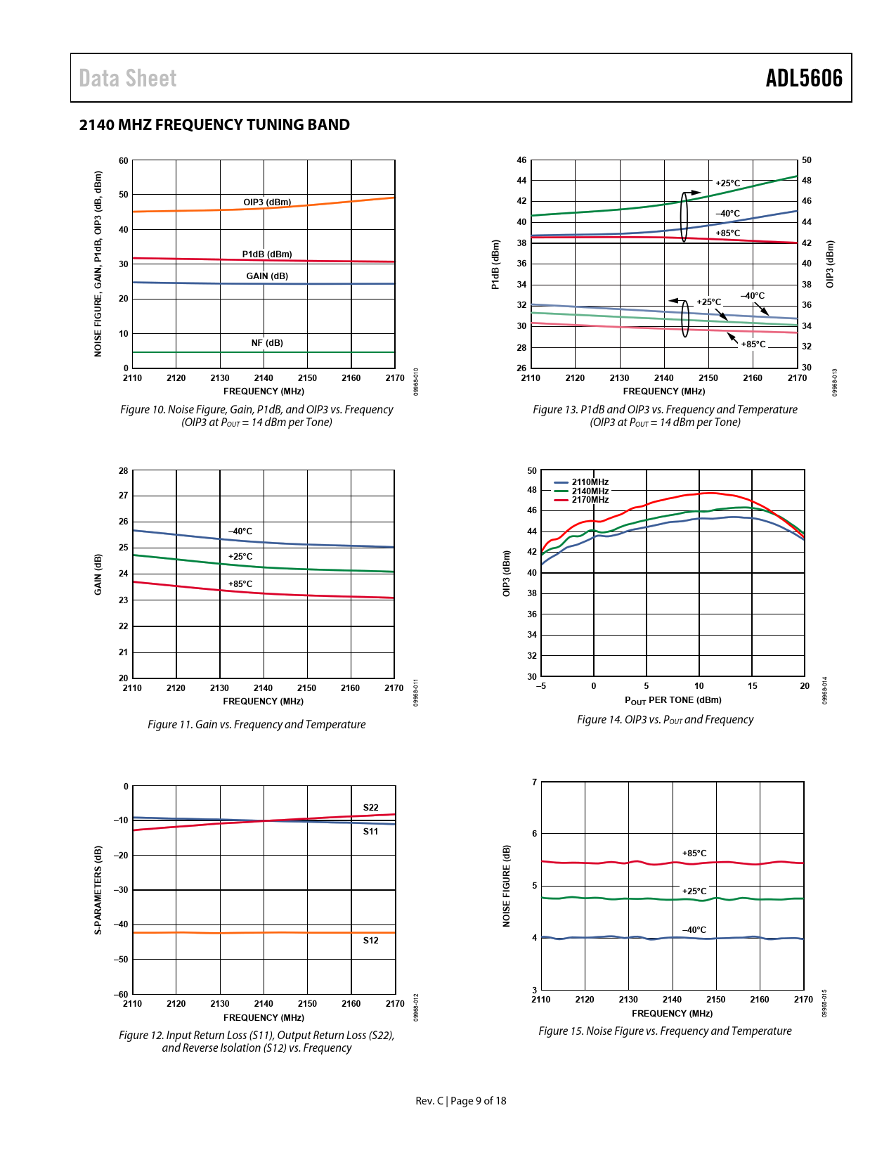 Data SheetADL56062140 MHZ FREQUENCY TUNING BAND604650) m4448+25°C, dB50B4246dOIP3 (dBm)3 (–40°C404440, OIP+85°CB))3842mm1dP1dB (dBm)dB, P30dB(3640IN3 (GAIN (dB)1dB3438POIP, GA E–40°CR20+25°CU3236G FI3034E10ISNF (dB)O28+85°C32N026302110212021302140215021602170 010 2110212021302140215021602170 013 FREQUENCY (MHz) 09968- FREQUENCY (MHz) 09968- Figure 10. Noise Figure, Gain, P1dB, and OIP3 vs. Frequency Figure 13. P1dB and OIP3 vs. Frequency and Temperature (OIP3 at POUT = 14 dBm per Tone) (OIP3 at POUT = 14 dBm per Tone) 28502110MHz48272140MHz2170MHz4626–40°C4425))42+25°Cm(dB2440IN+85°C3 (dB PGAOI382336223421322030 4 2110212021302140215021602170 011 –505101520 01 8- FREQUENCY (MHz)P 09968- OUT PER TONE (dBm) 0996 Figure 11. Gain vs. Frequency and Temperature Figure 14. OIP3 vs. POUT and Frequency 07S22–10S116)B)–20B+85°C(d(dSREERUT5E–30IG F+25°CISEARAM -P–40NOS–40°CS124–50–603 015 2110212021302140215021602170 012 2110212021302140215021602170FREQUENCY (MHz)FREQUENCY (MHz) 09968- 09968- Figure 12. Input Return Loss (S11), Output Return Loss (S22), Figure 15. Noise Figure vs. Frequency and Temperature and Reverse Isolation (S12) vs. Frequency Rev. C | Page 9 of 18 Document Outline FEATURES APPLICATIONS GENERAL DESCRIPTION FUNCTIONAL BLOCK DIAGRAM TABLE OF CONTENTS REVISION HISTORY SPECIFICATIONS TYPICAL SCATTERING PARAMETERS ABSOLUTE MAXIMUM RATINGS THERMAL RESISTANCE ESD CAUTION PIN CONFIGURATION AND FUNCTION DESCRIPTIONS TYPICAL PERFORMANCE CHARACTERISTICS 1960 MHZ FREQUENCY TUNING BAND 2140 MHZ FREQUENCY TUNING BAND 2630 MHZ FREQUENCY TUNING BAND GENERAL APPLICATIONS INFORMATION BASIC LAYOUT CONNECTIONS Power Supply RF Input Interface RF Output Interface Power-Down ADL5606 MATCHING ACPR AND EVM THERMAL CONSIDERATIONS SOLDERING INFORMATION AND RECOMMENDED PCB LAND PATTERN EVALUATION BOARD OUTLINE DIMENSIONS ORDERING GUIDE