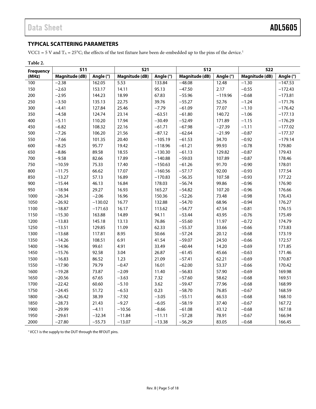| Pages / Page | 18 / 5 — Data Sheet. ADL5605. TYPICAL SCATTERING PARAMETERS. Table 2. Frequency. … |